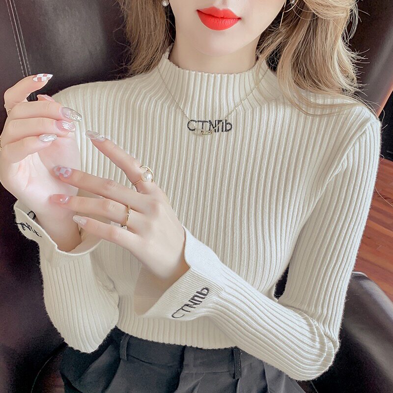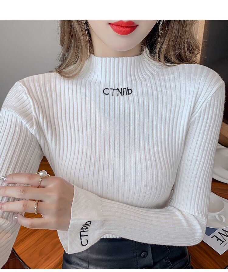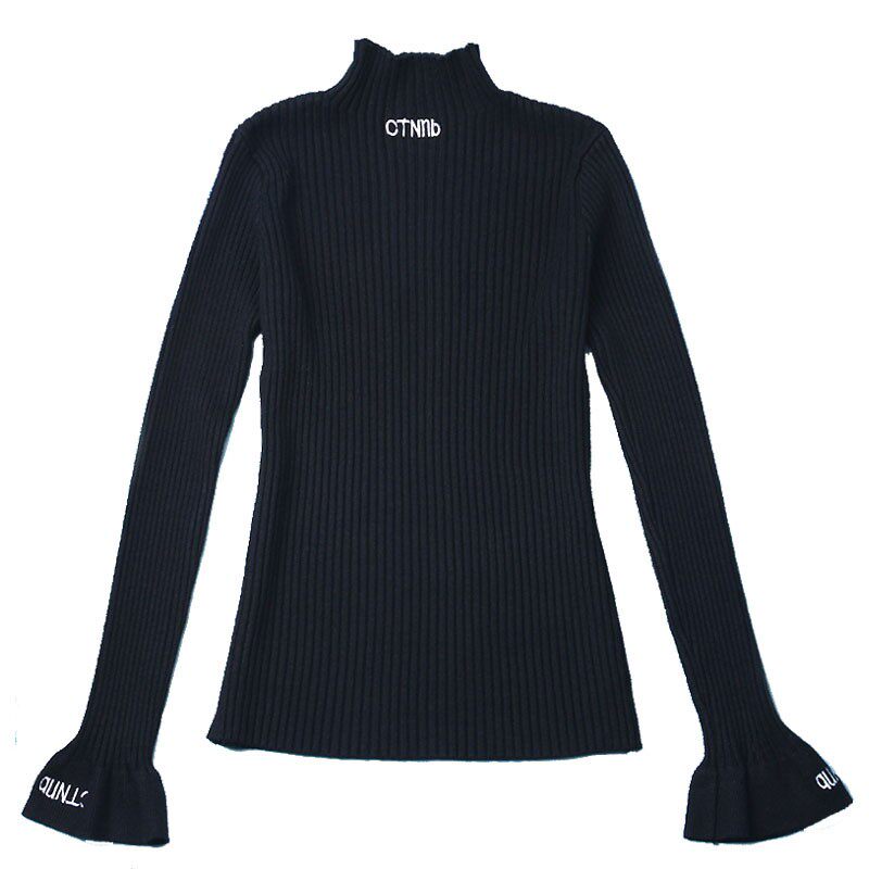 High collar letter embroidery knitted sweater trumpet sleeve elastic slim fit autumn and winter tops with bottoming shirt pullover women