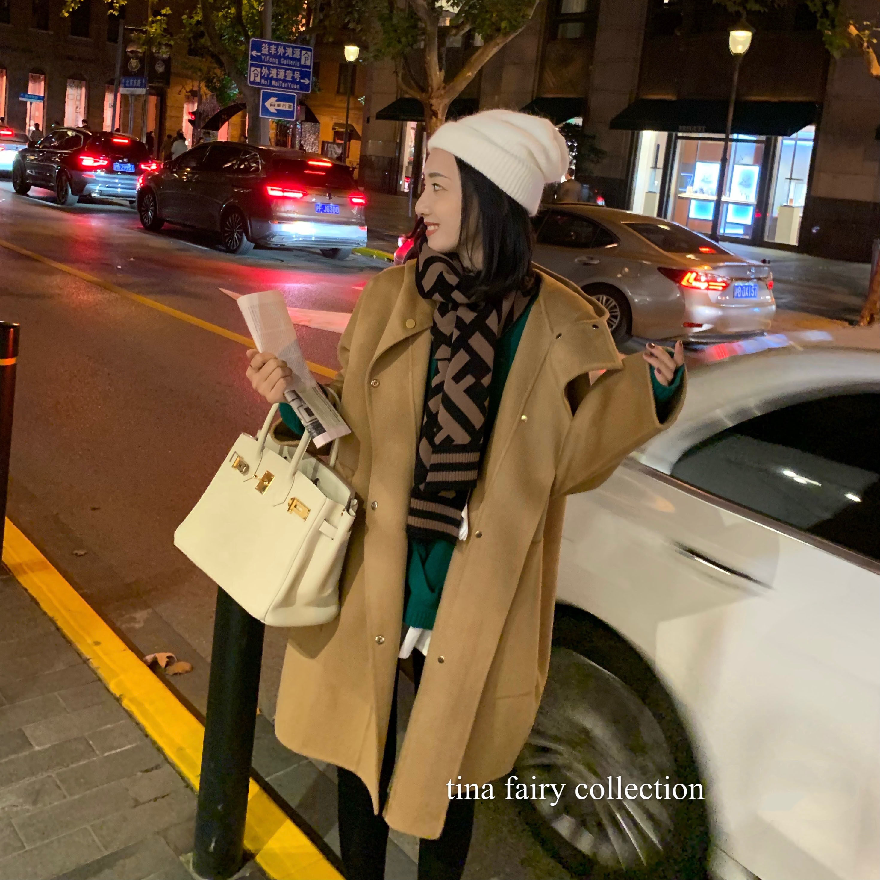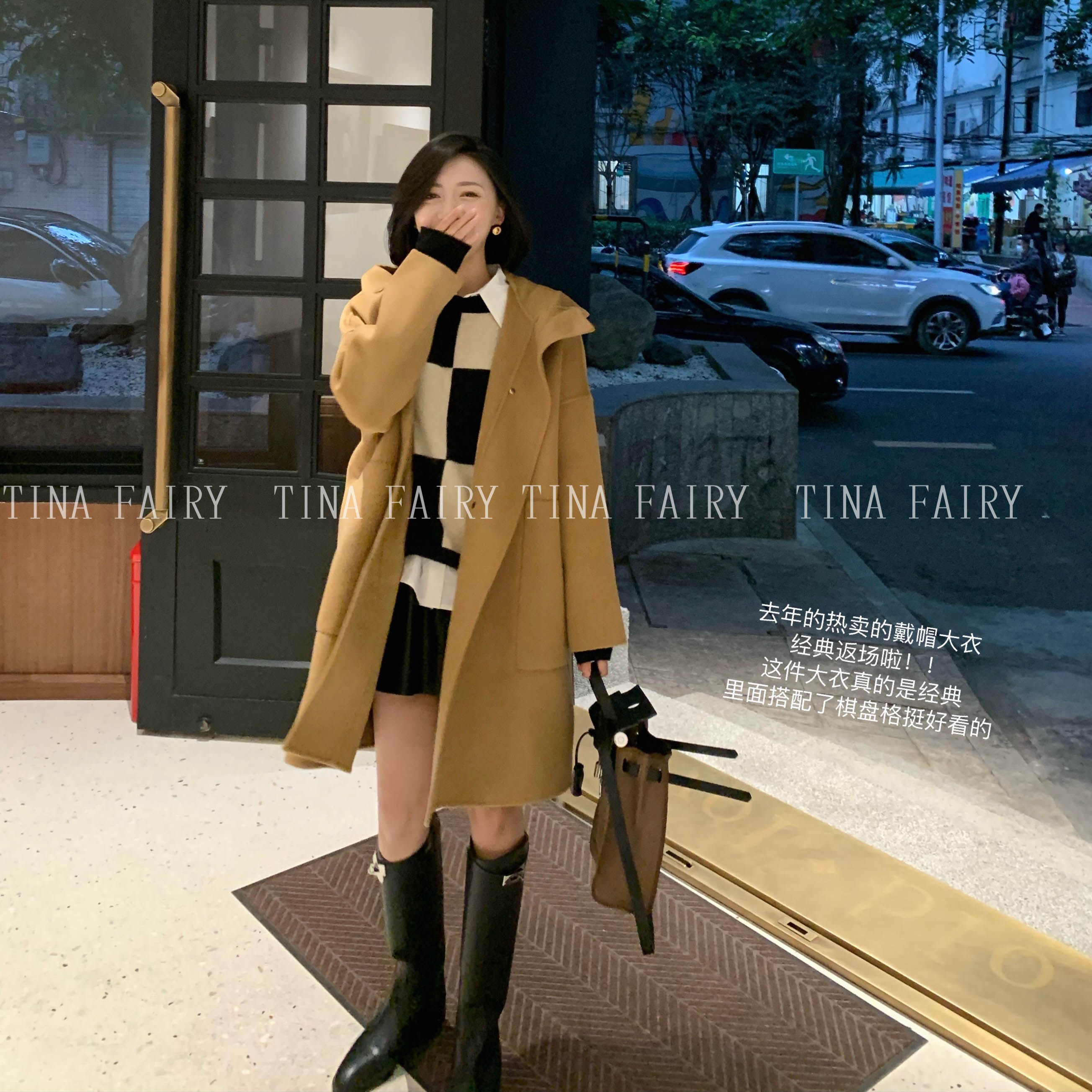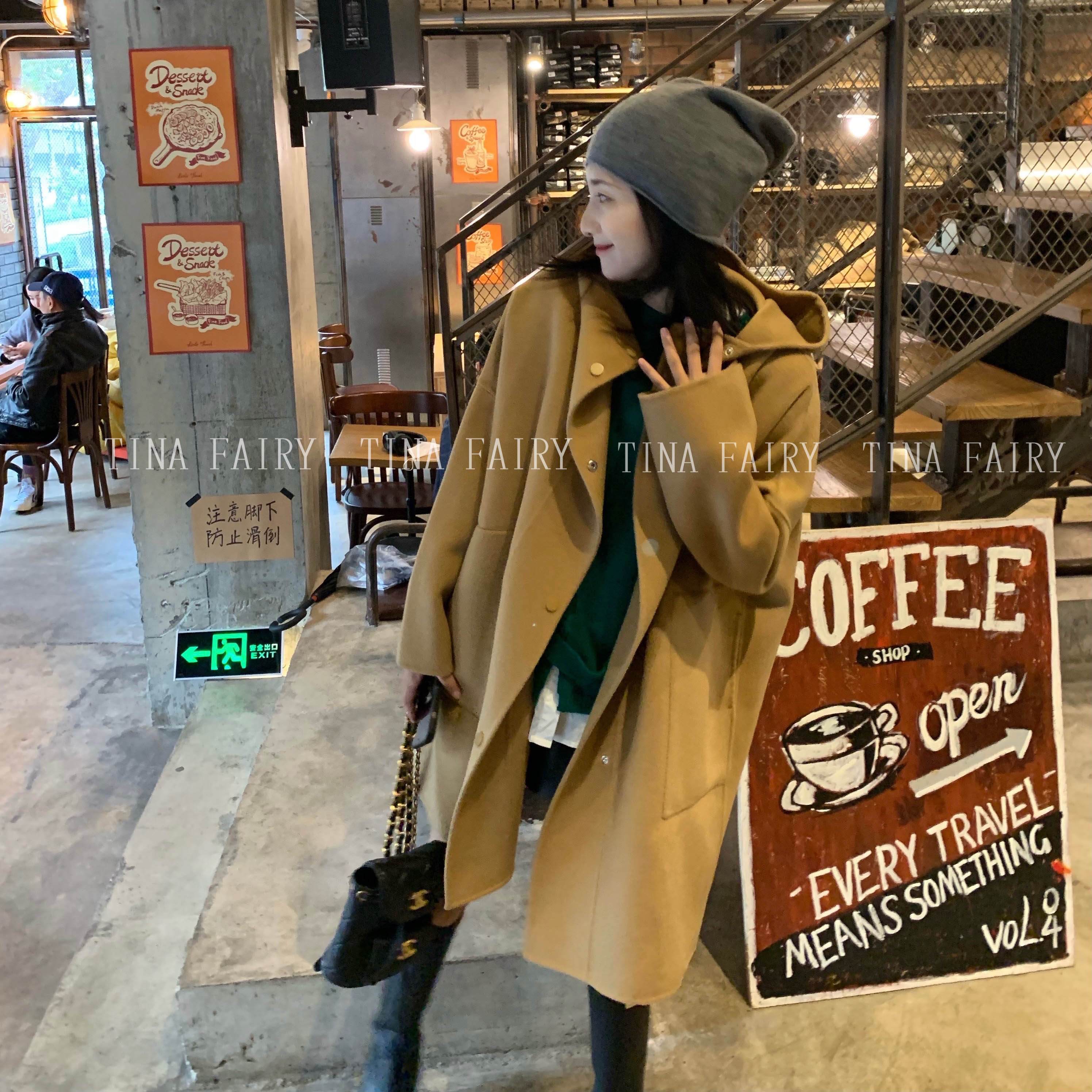 tinafairy full wool hooded camel temperament woolen coat women's winter mid-length double-sided woolen coat