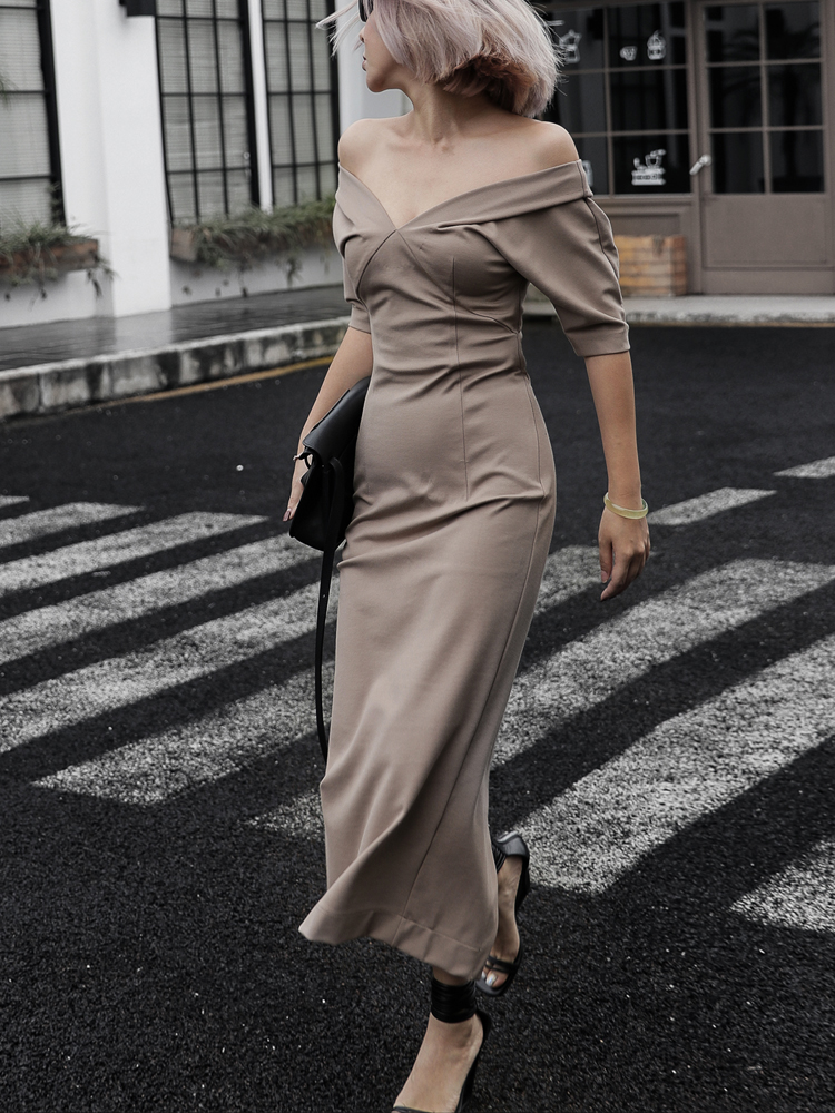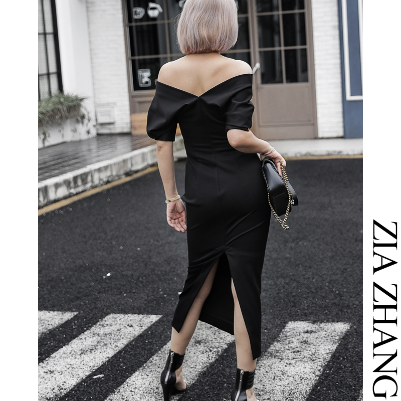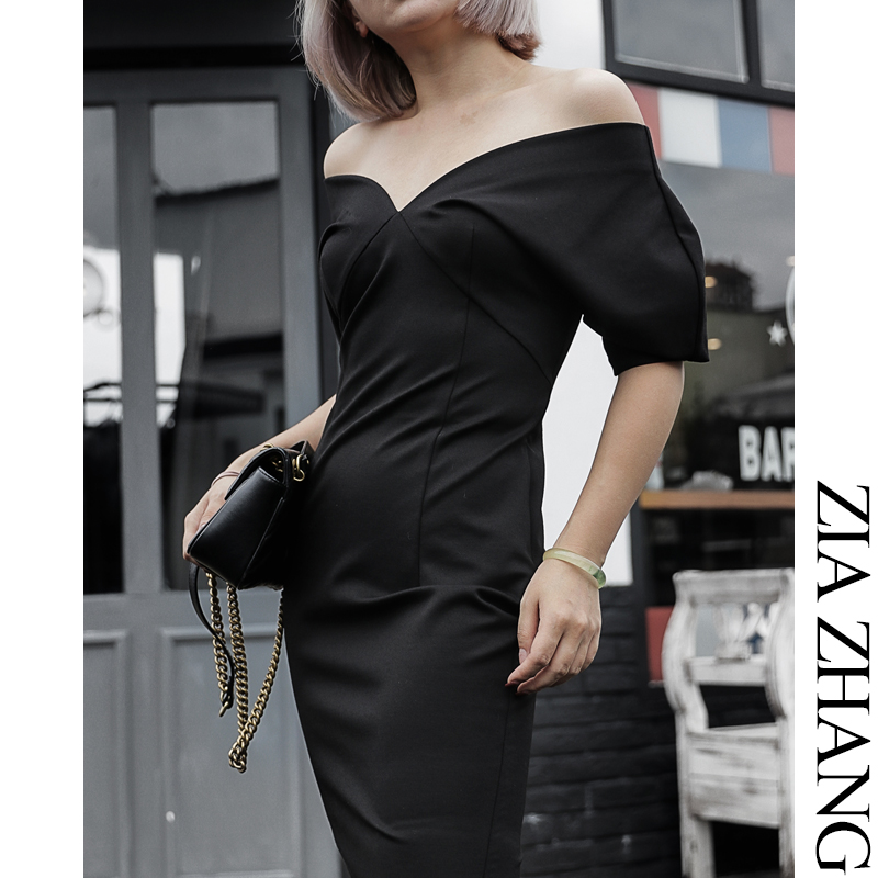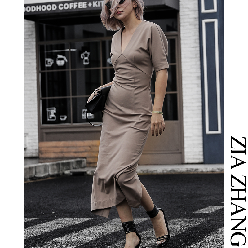 Z boss V collar short sleeve swarm dress with hanging shoulder and sheep leg sleeves two in medium long version of the dress