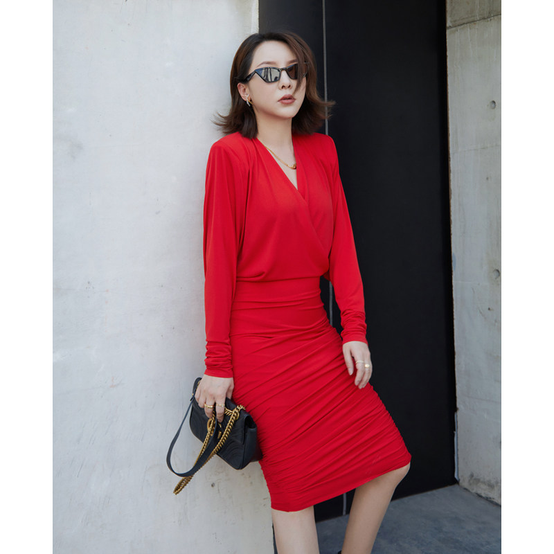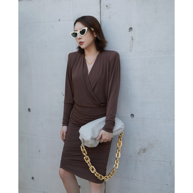 Z boss Moden V collar Long version Ocean dress Double design ruffle flat shoulder Sheep sleeves Ocean dress