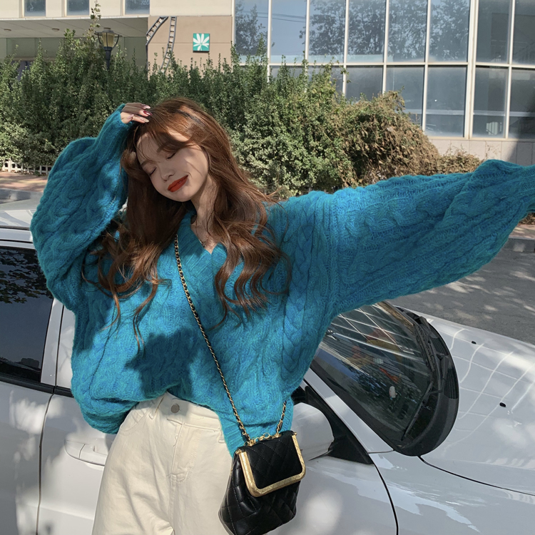 Twist sweater women's loose outerwear 2021 new spring and autumn gentle V-neck pullover lazy wind knitted jacket top