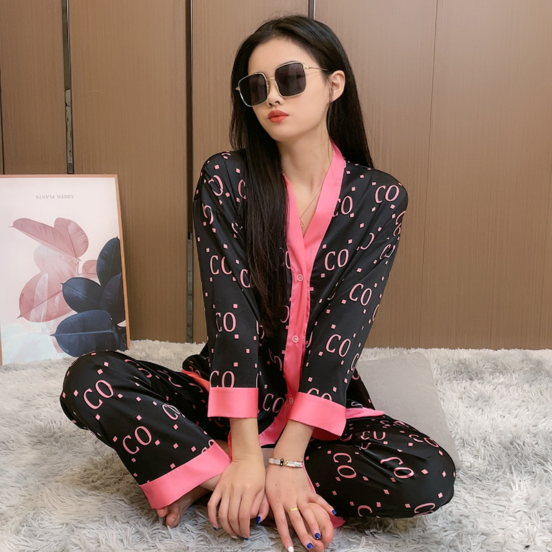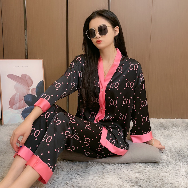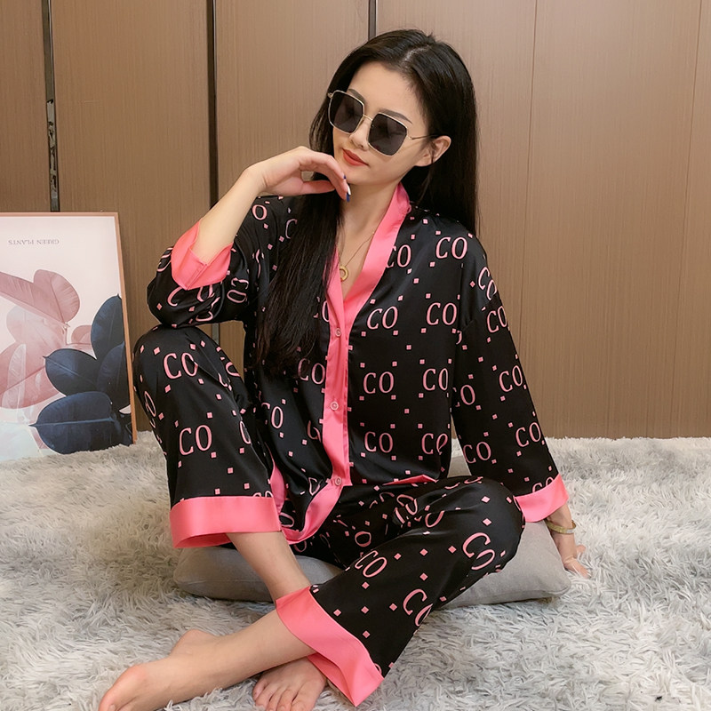 Spring and autumn pajamas women's sweet ice silk long-sleeved V-neck homewear suit 2022 spring new large size cardigan
