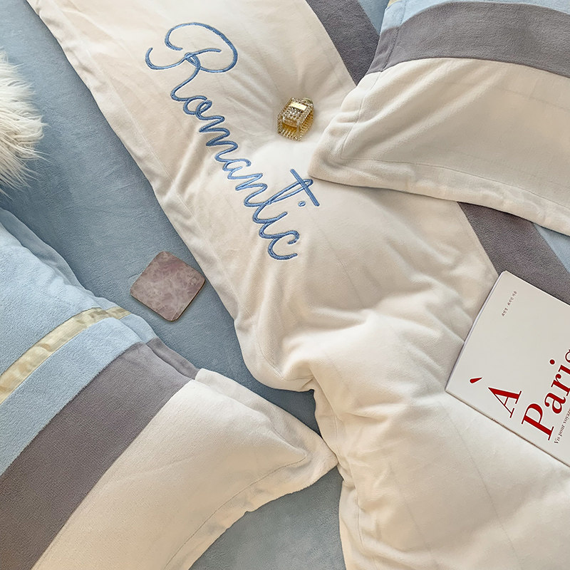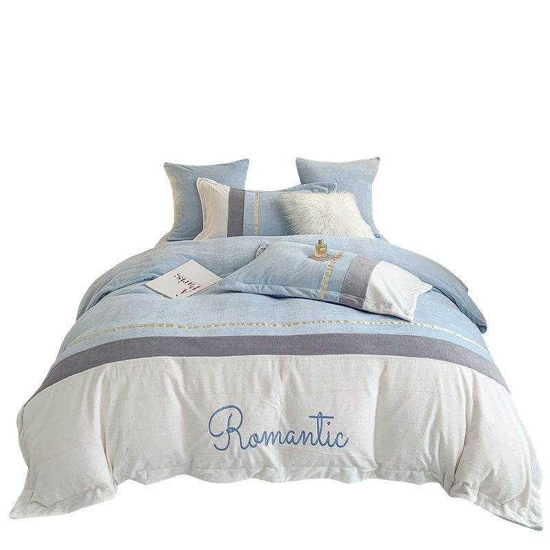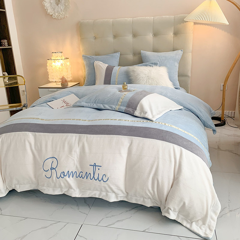 Winter thickened milk velvet four-piece simple coral velvet linen linen embroidery quilt cover flannel bedding