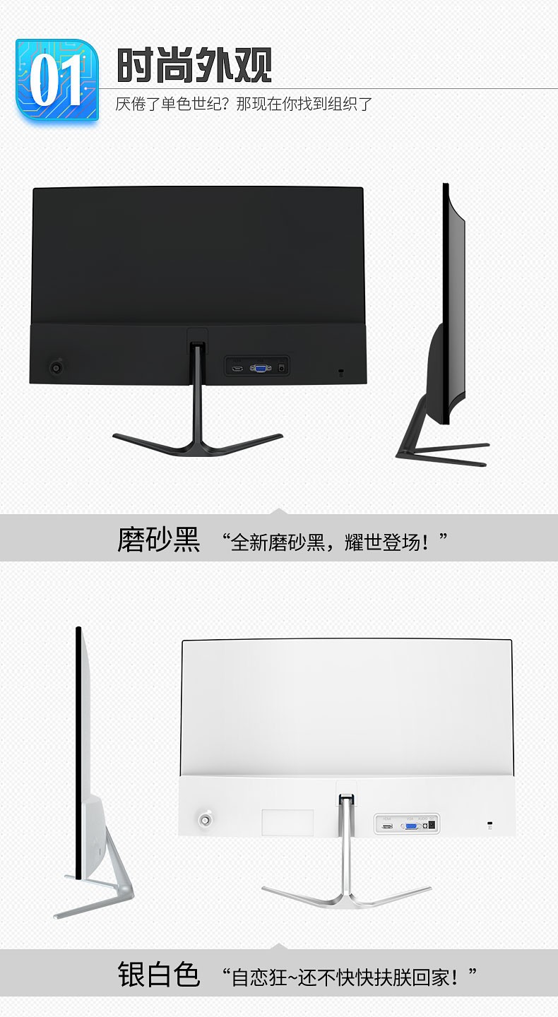 24-inch straight screen borderless white (VGA HDMI)24-inch curved screen borderless white (VGA HDMI)27-inch straight screen borderless white (VGA HDMI)