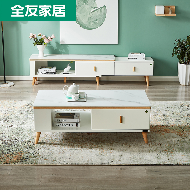 Full Friend Home Nordic Tea Table TV Cabinet Composition Living Room Tempered Glass Tea Table Retractable TV Cabinet