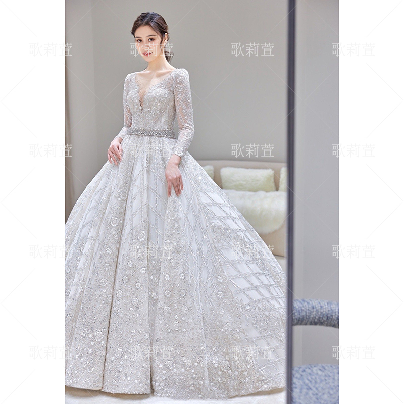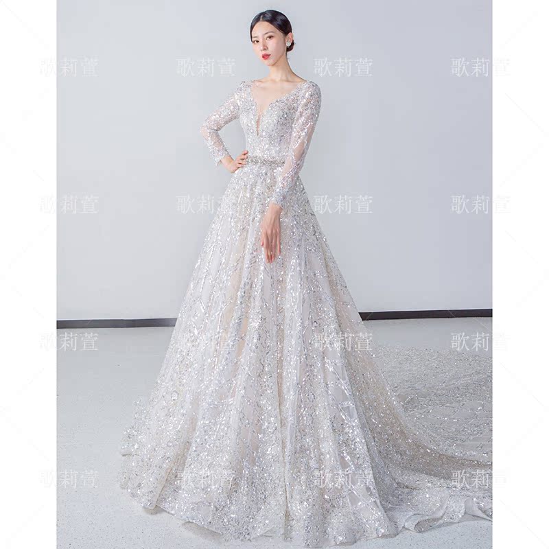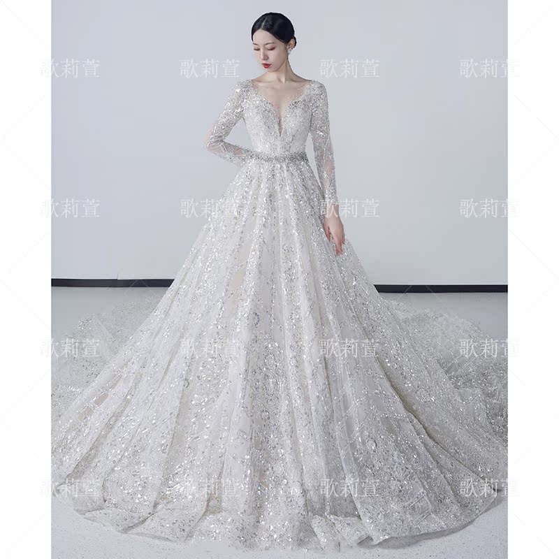 Long sleeves Heavy work extravagant staple wedding dress 2022 new Temperament Bride Little Subminimalist Palace Wind Tug Tail summer