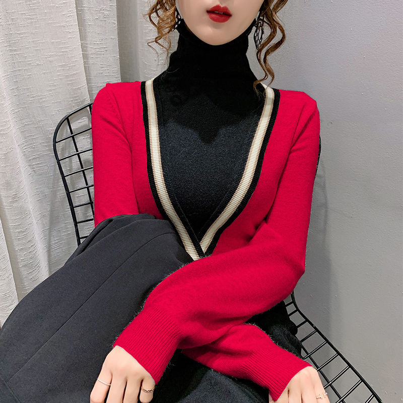 Pile pile turtleneck sweater women's autumn and winter outer wear large size 200 jin fake two pieces of Western style inner stitching knitted bottoming shirt