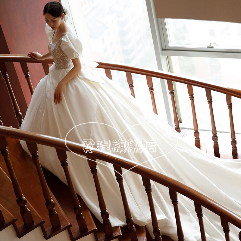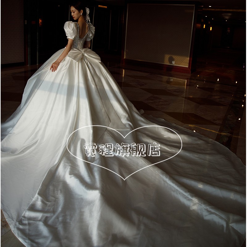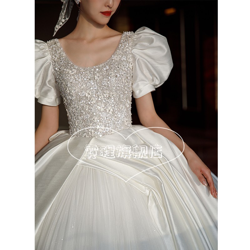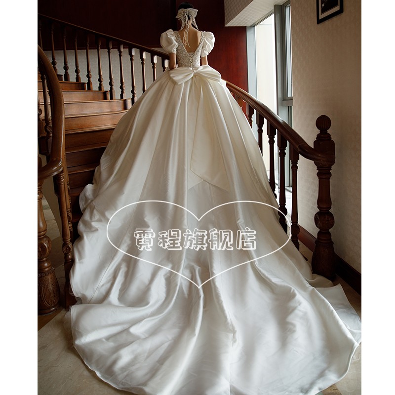 Satin main wedding dress 2021 new bride big tail retro French light out gauze 2022 simple female one word shoulder