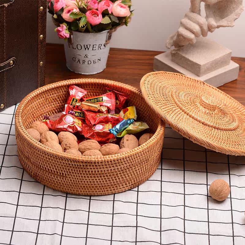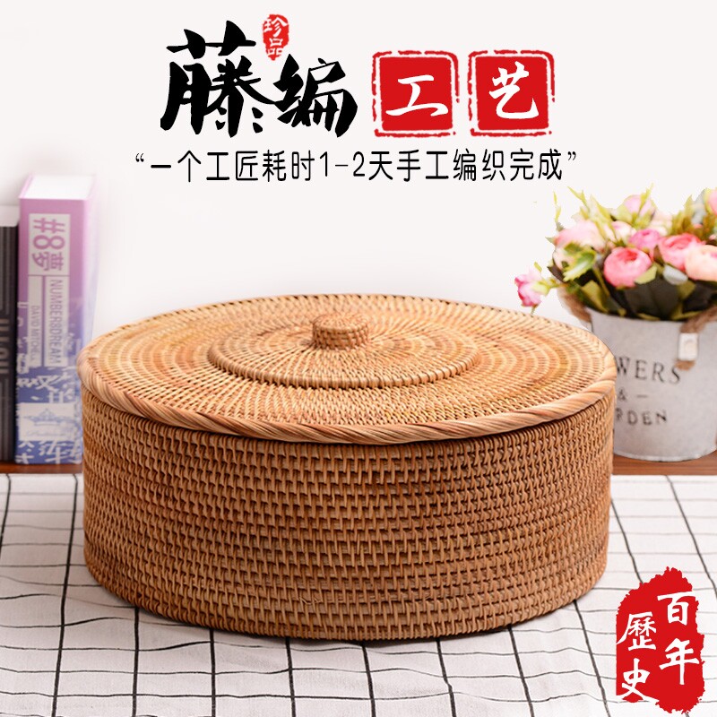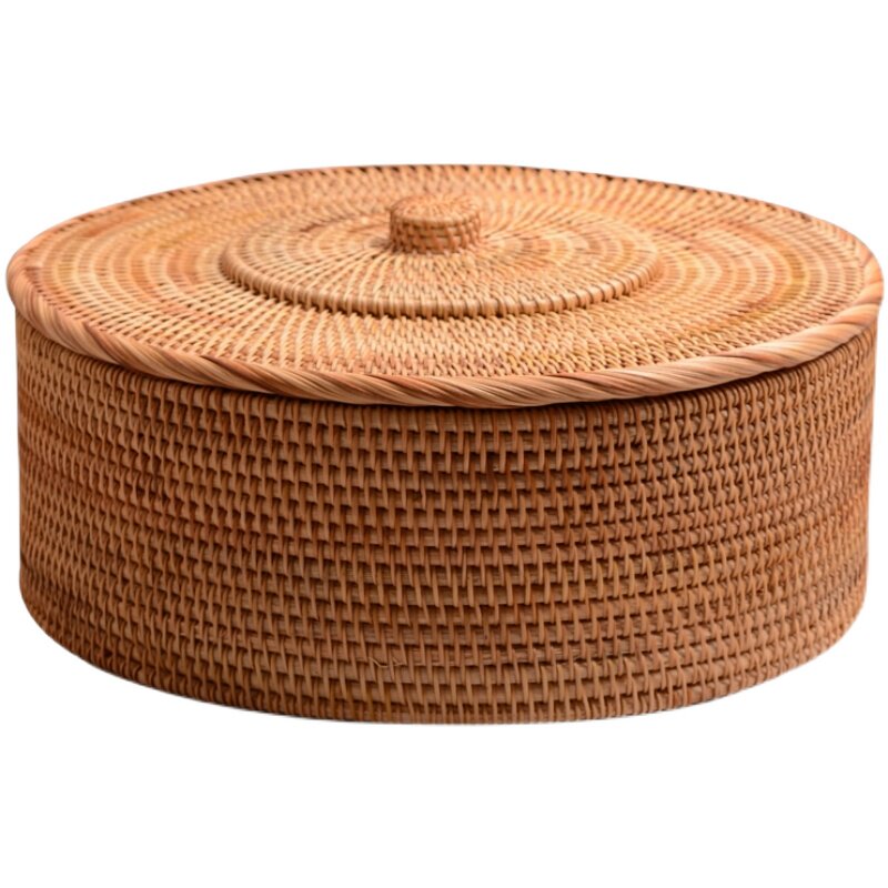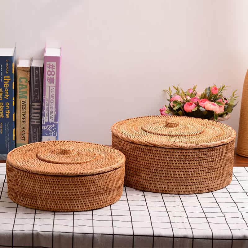 Rattan storage box desktop bedside storage box retro coffee table grain candy box round with lid debris sorting box