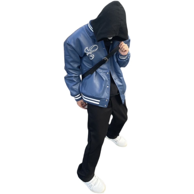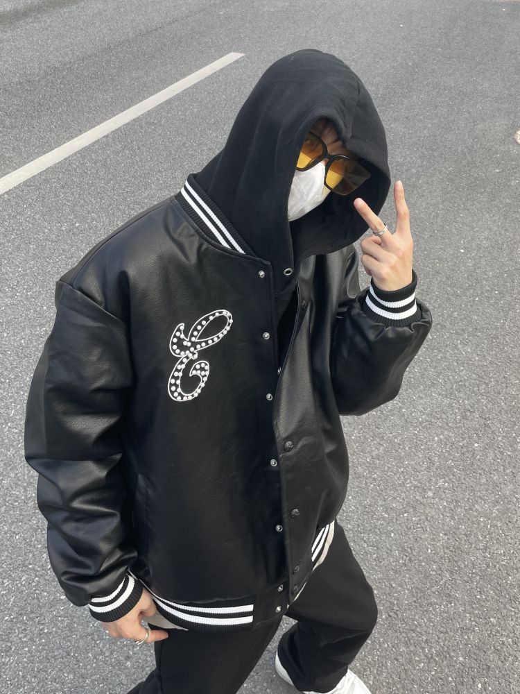 American high street vibe autumn and winter cotton jacket men ins trend PU leather baseball jacket Europe and the United States hip-hop pearl jacket