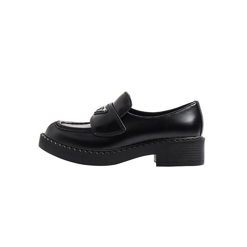 Retro triangle label loafers women's spring and autumn black British style small leather shoes thick bottom medium heel thick heel slip-on shoes