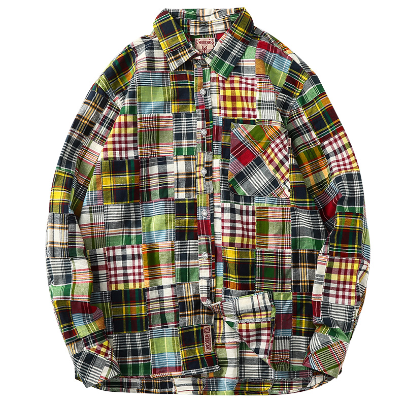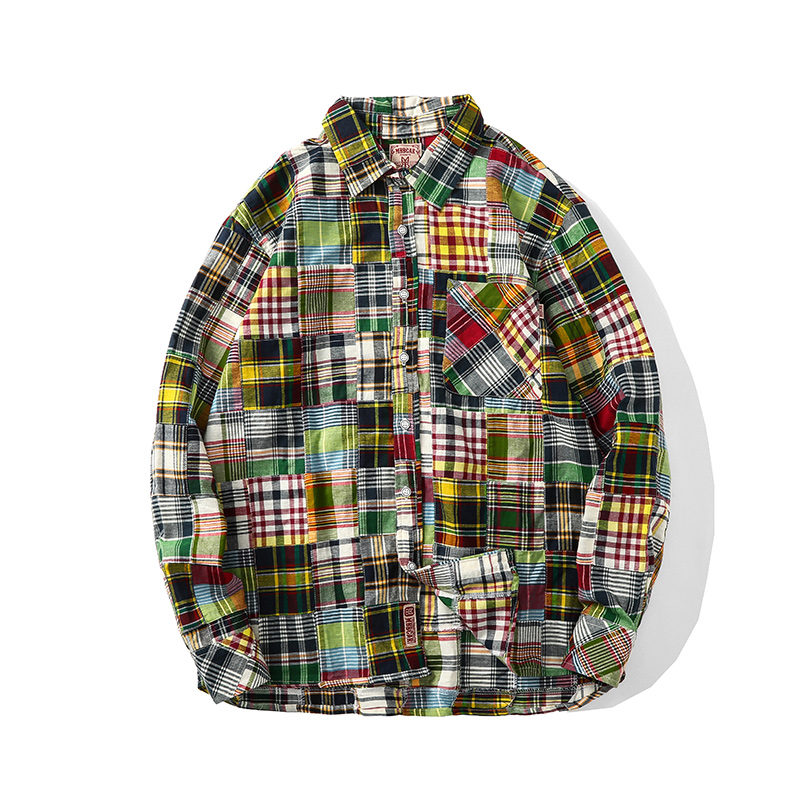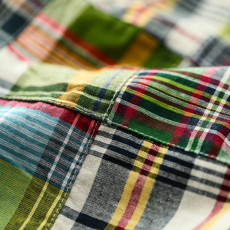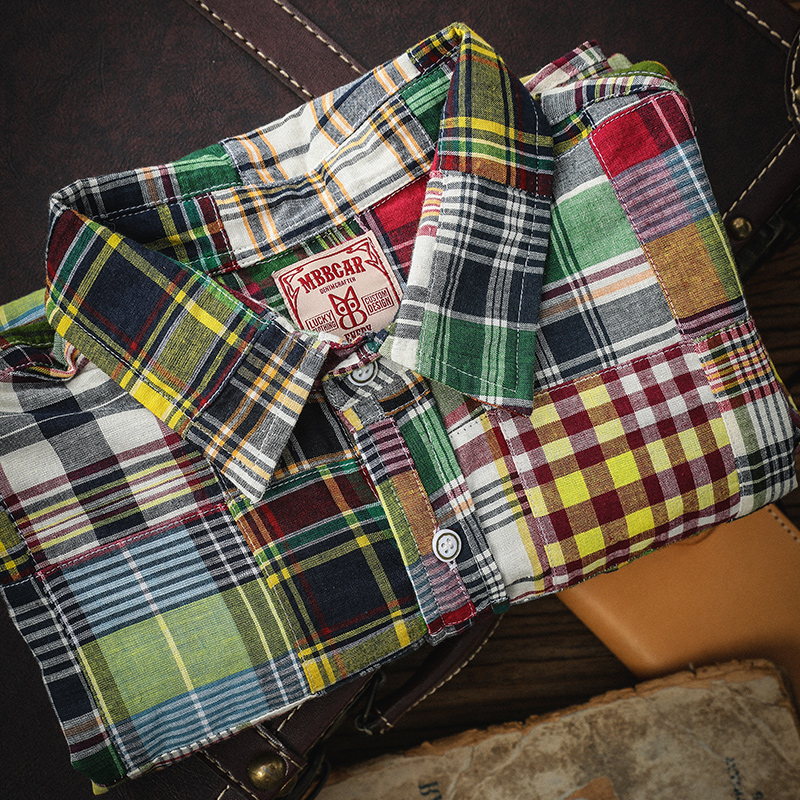 MBBCAR narrow hand-cut stitching Baijia cloth shirt Ami khaki retro unique plaid shirt broken green