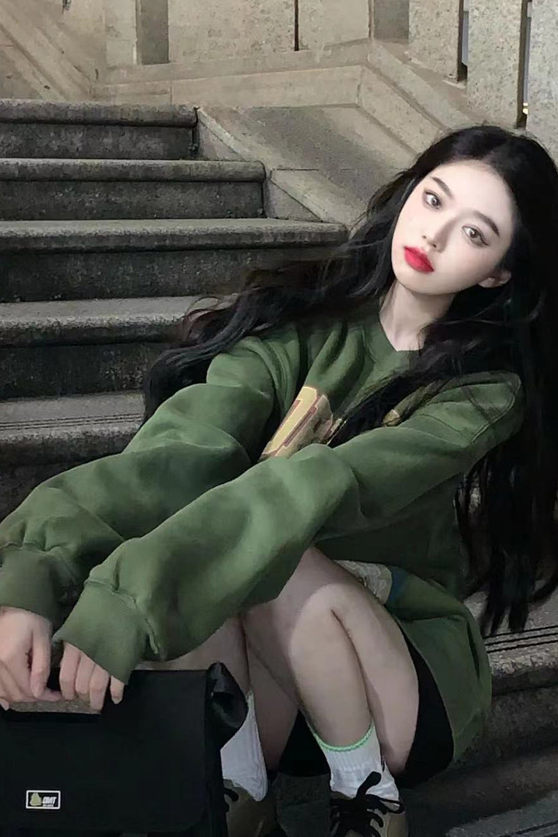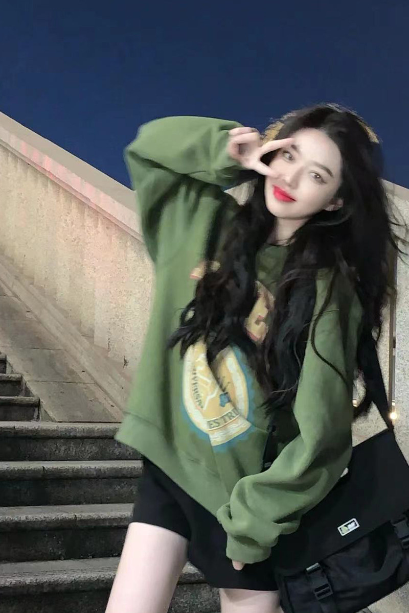 Autumn and winter little red book American retro sweater no gender heavy round neck pullover autumn and winter dark green trend plus velvet