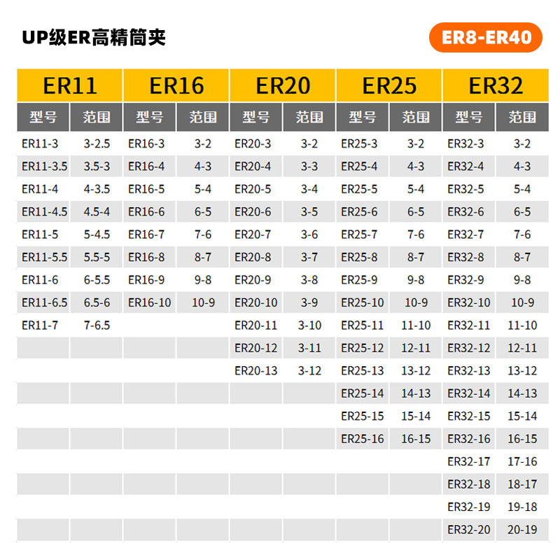 ER11-(3-7)-UP level ER16-(3-10)-UP level ER20-(3-13)-UP level ER25-(3-16)-UP level E