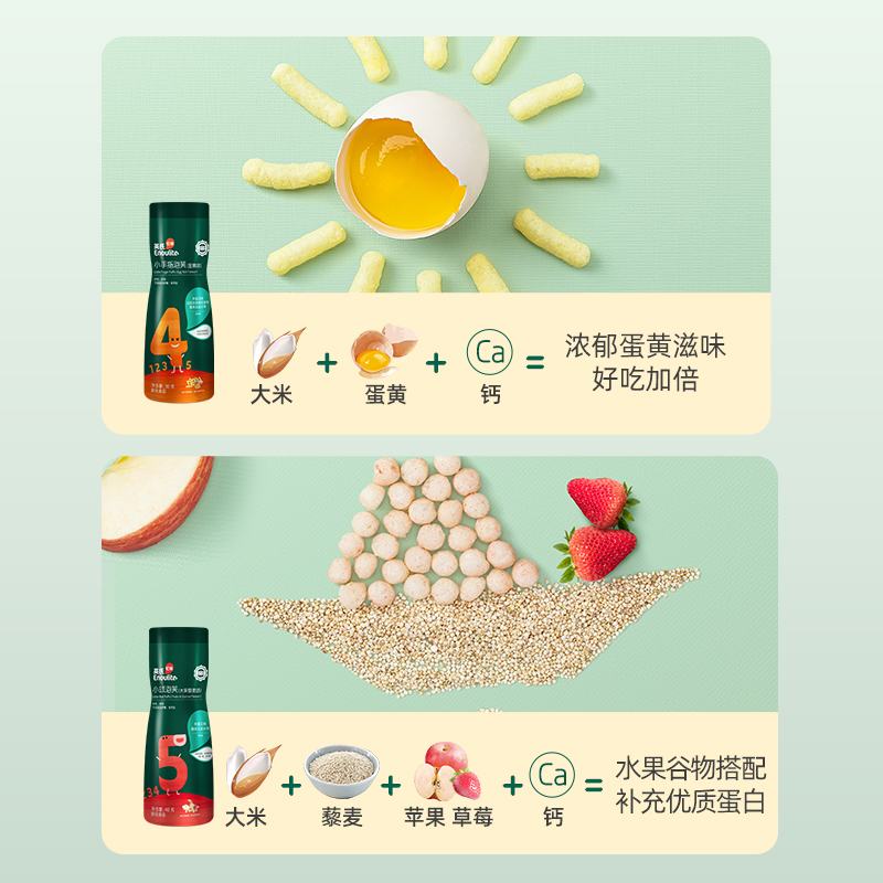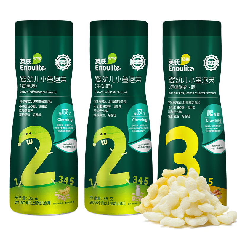 Stage 2 (small fish puffs) milk flavor 2 stages (small fish puffs) banana flavors 3 stages (small fish puffs) cod carrot flavor 4 stages (pink puffs) egg yolk flavor 5 stages (small ball puffs)