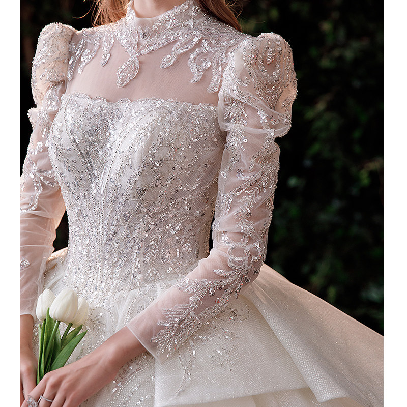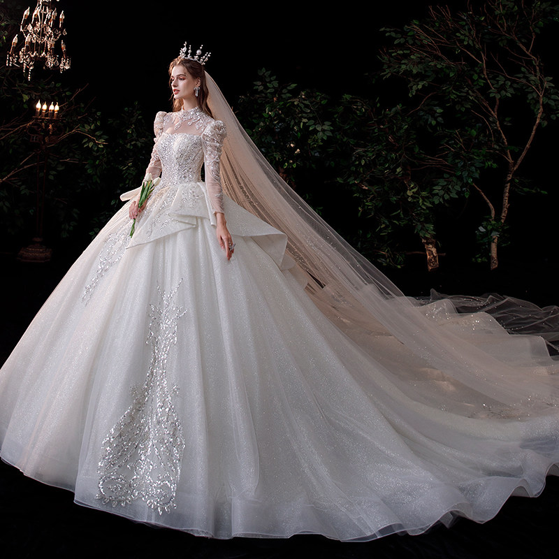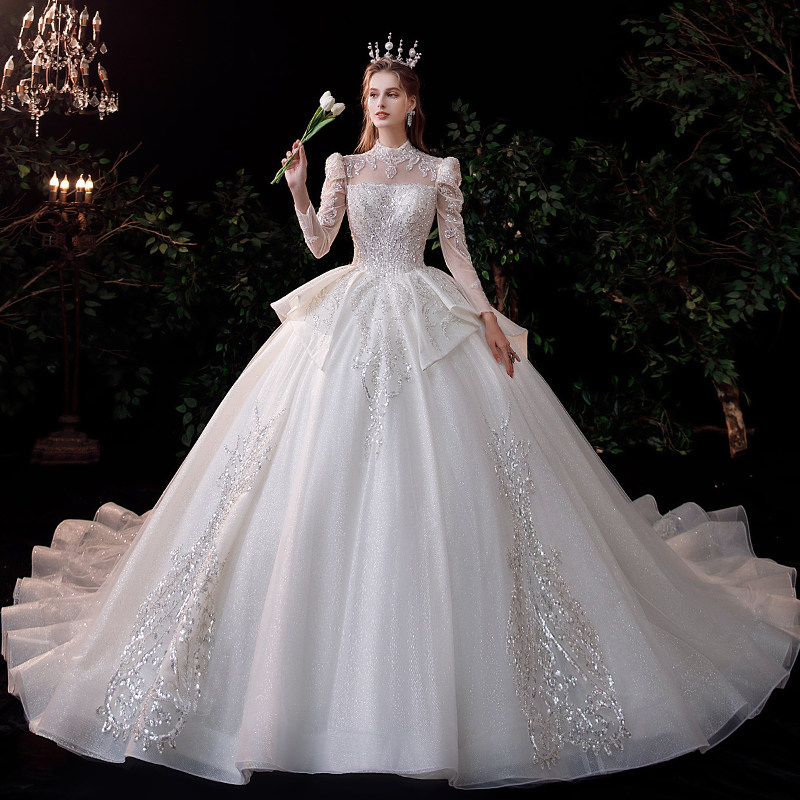 Heavy work main wedding dress 2021 new bridal temperament high-end French court style palace wind trailing big size for slim and long sleeves winter