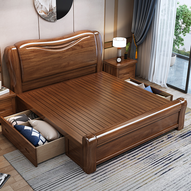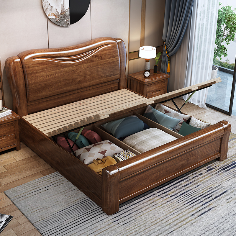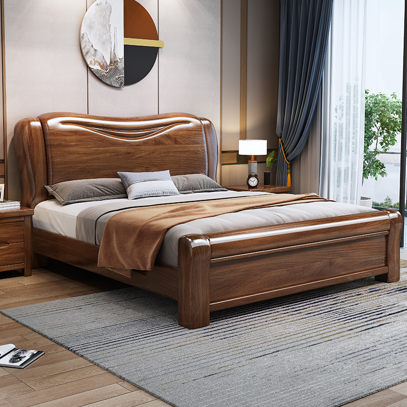 Golden silk walnut solid wood bed 1 8 meters modern minimalist big bed new Chinese double bed 1 5 master bedroom storage wedding bed