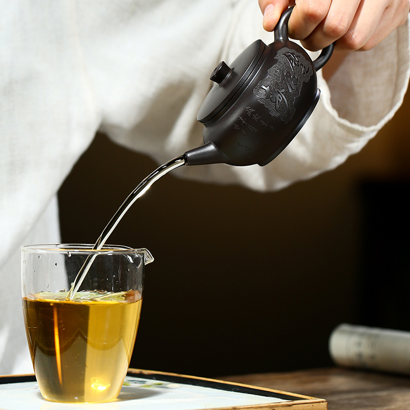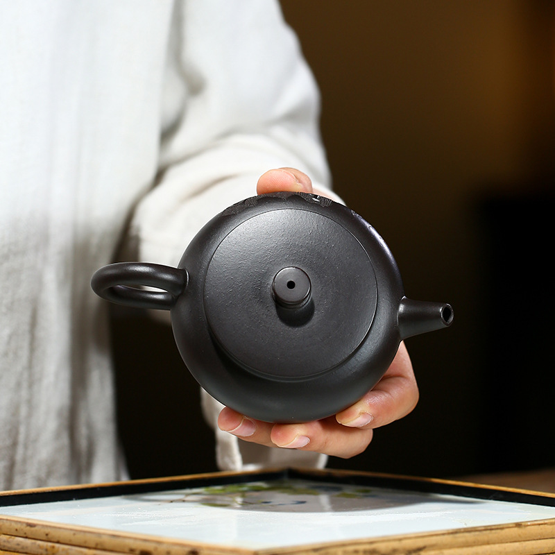 Purple Sand Pot full-hand carved small capacity original mine black Zhu mud Yixing Centered Kungfu Tea with Wang Ting