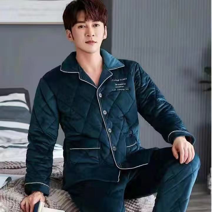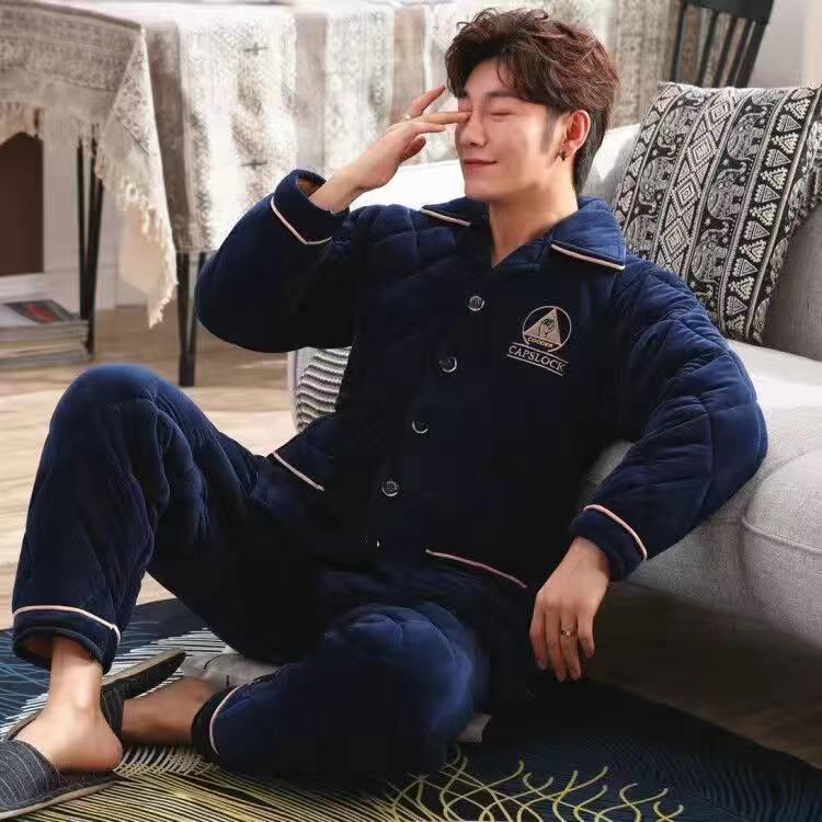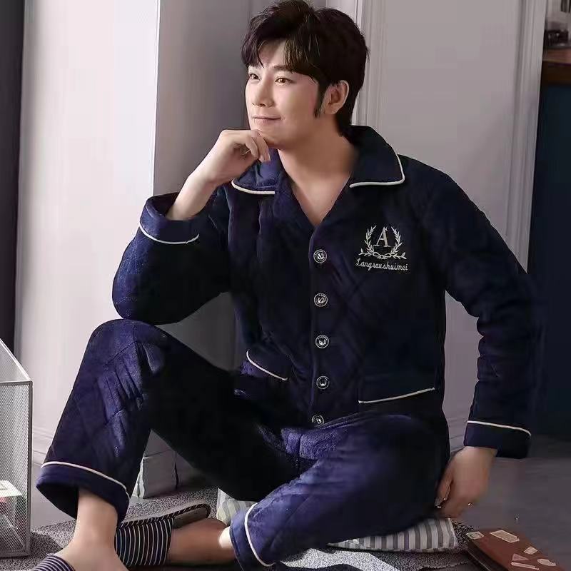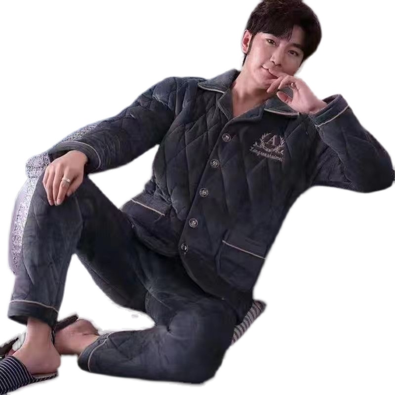Men's pajamas winter three-layer quilted large size plus velvet jacket youth coral fleece warm single top thickened home clothes