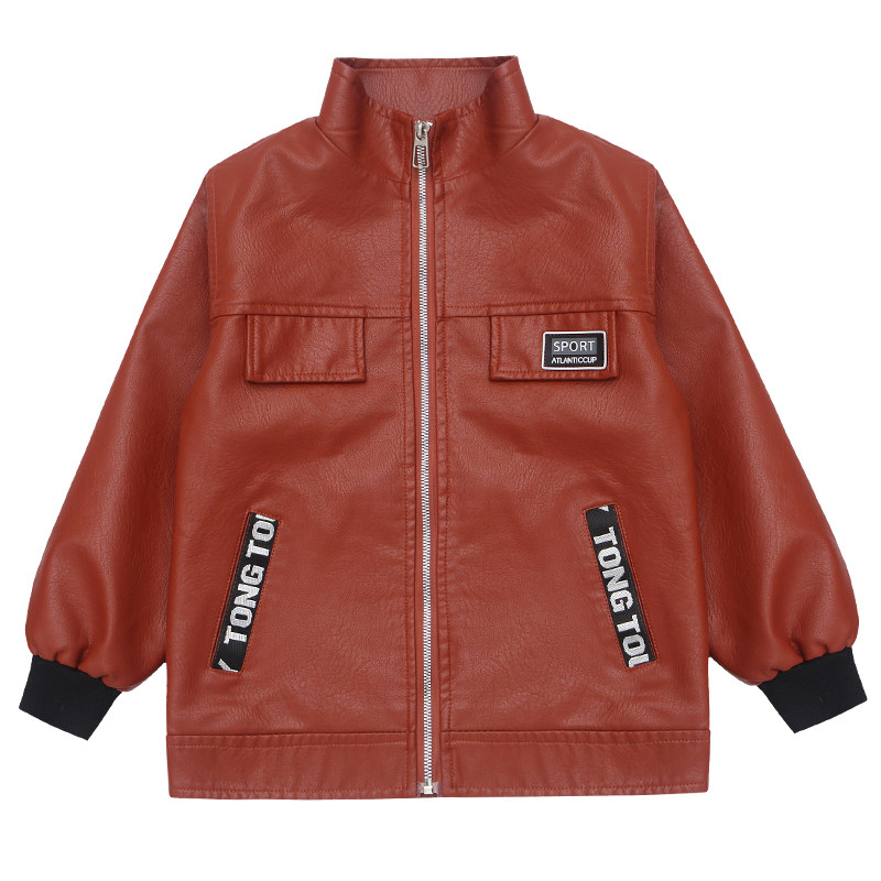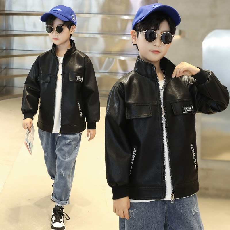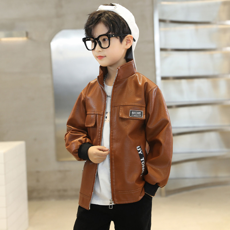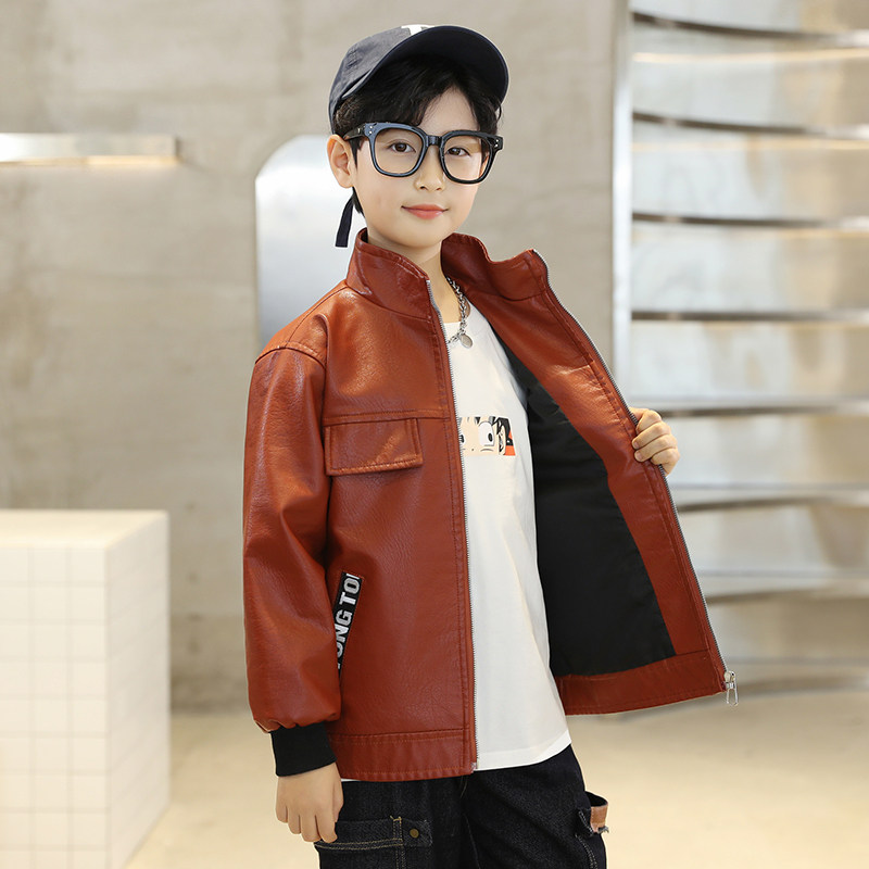 Boys' leather jacket 2022 spring and autumn new foreign style medium and large children's Korean style pocket ribbon stand collar leather jacket trendy