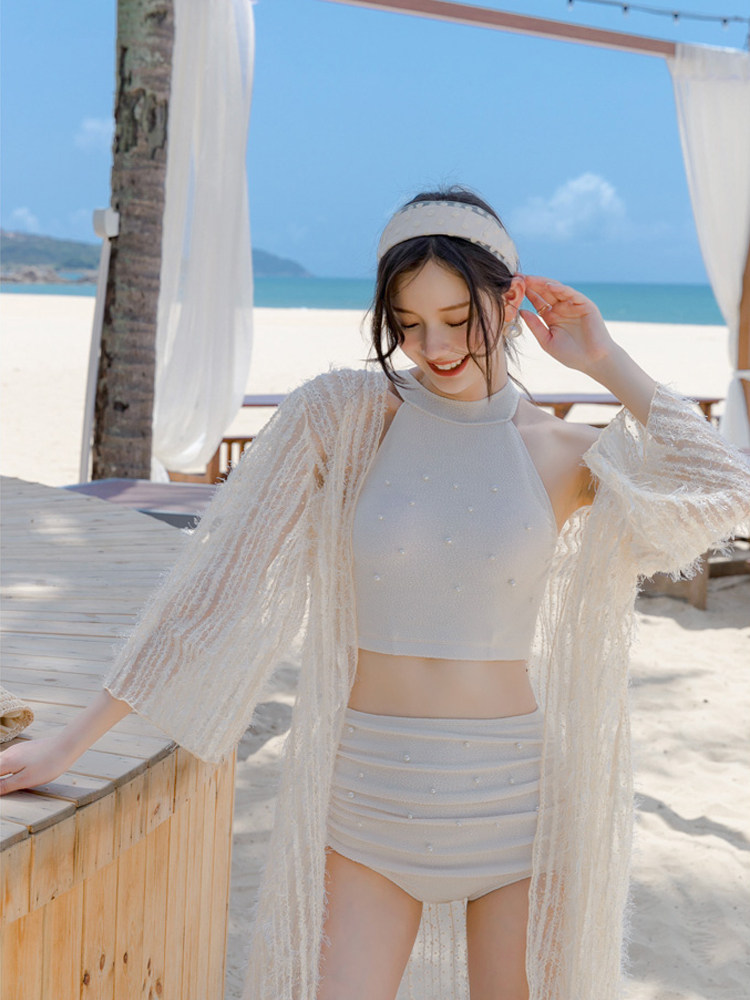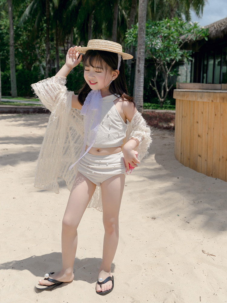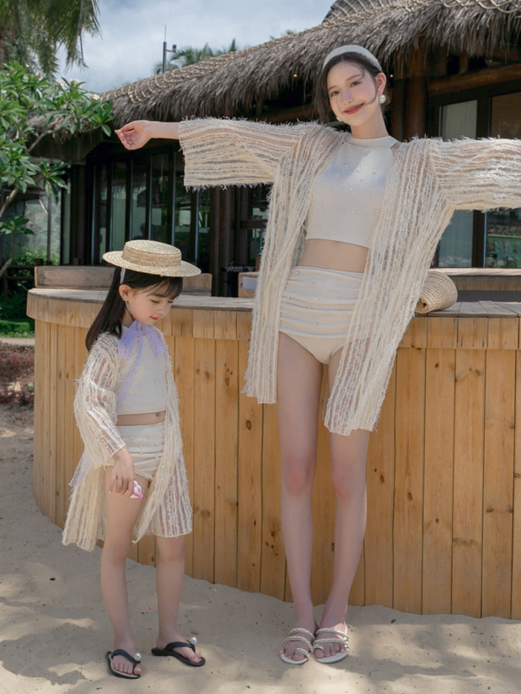 Hot spring parent-child swimsuits, mother and daughter split bikini three-piece set, long-sleeved sun protection, cute children's girls swimsuits