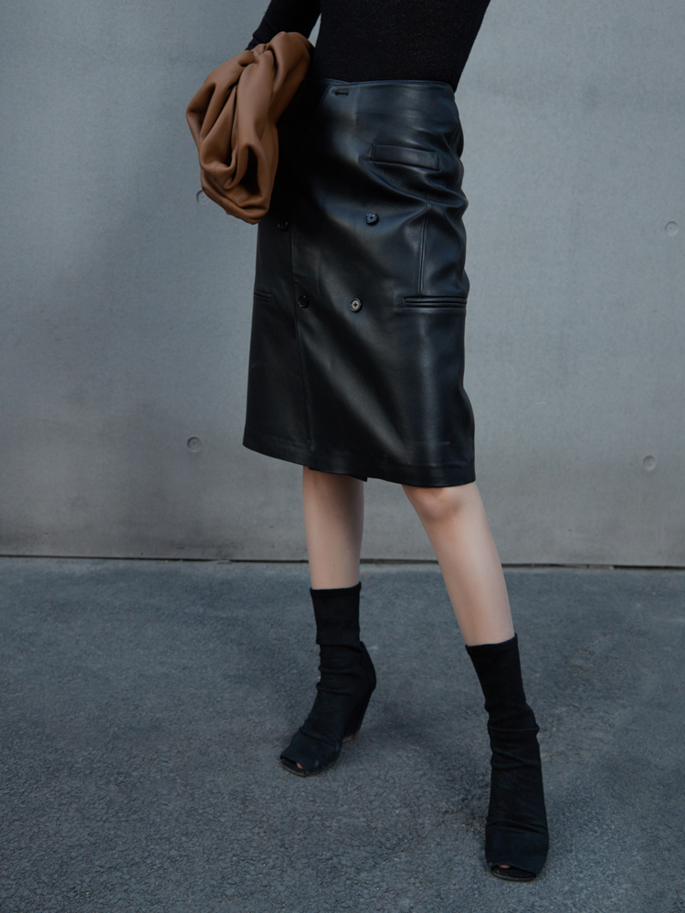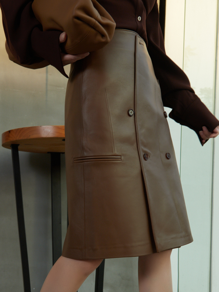 Boss Z Suit Element Design Leather Skirt Asymmetrical A-shaped Double-breasted Sheepskin Skirt Female
