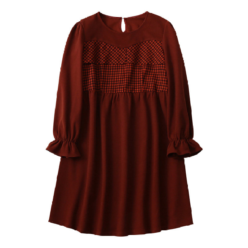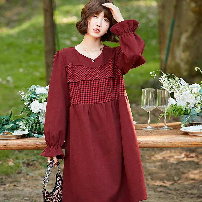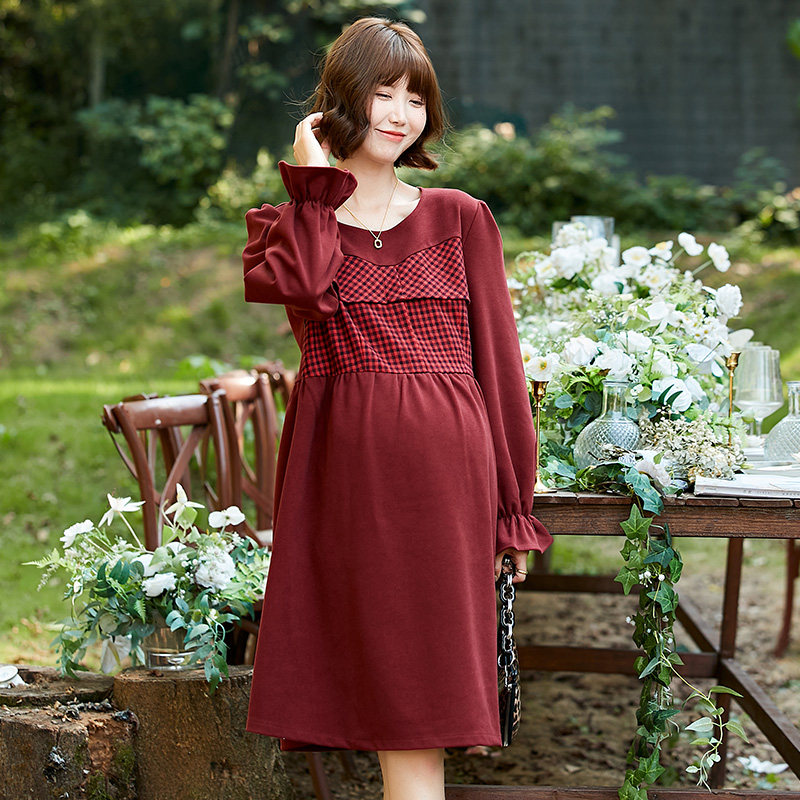 Winter pregnant women's long-sleeved dress round neck contrast color imitation woolen material solid color autumn and winter skirt loose mid-length Korean version of the tide