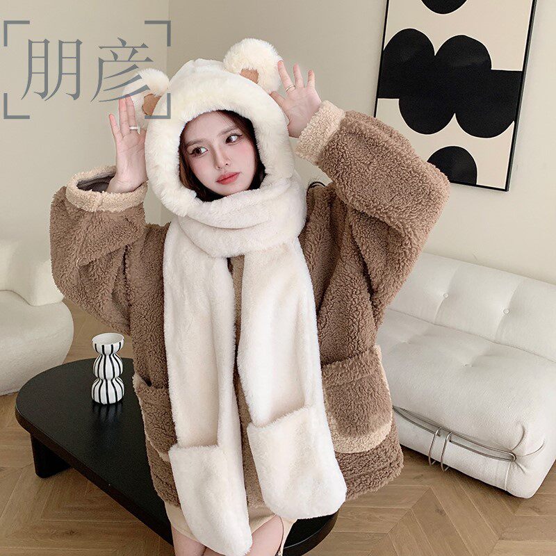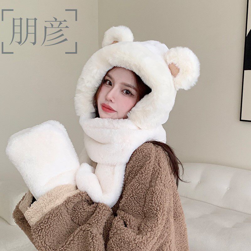 Autumn and winter new 2023 red bear hat scarf one woman thickened warm plush