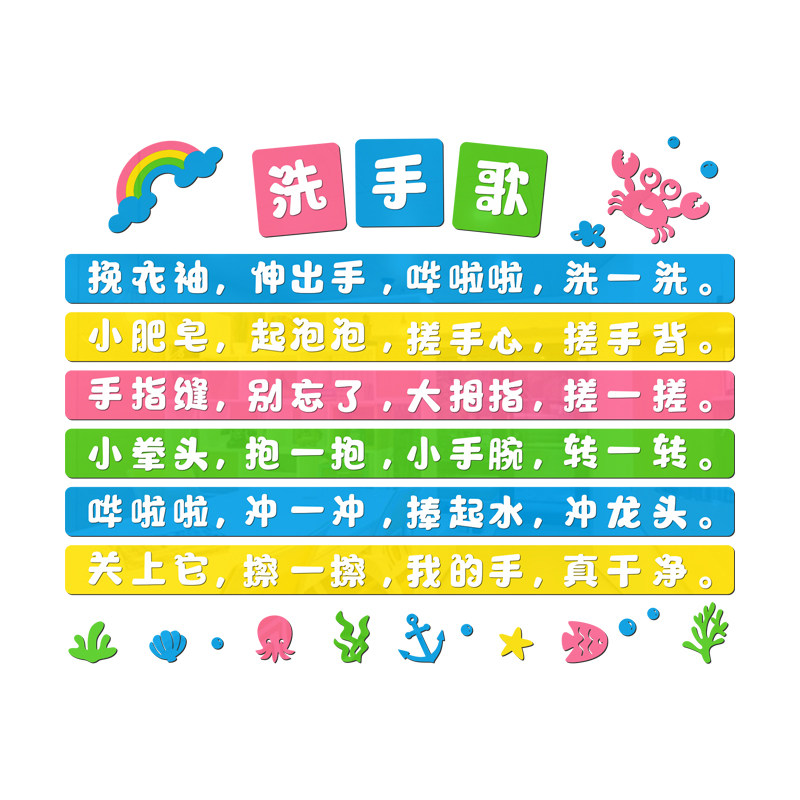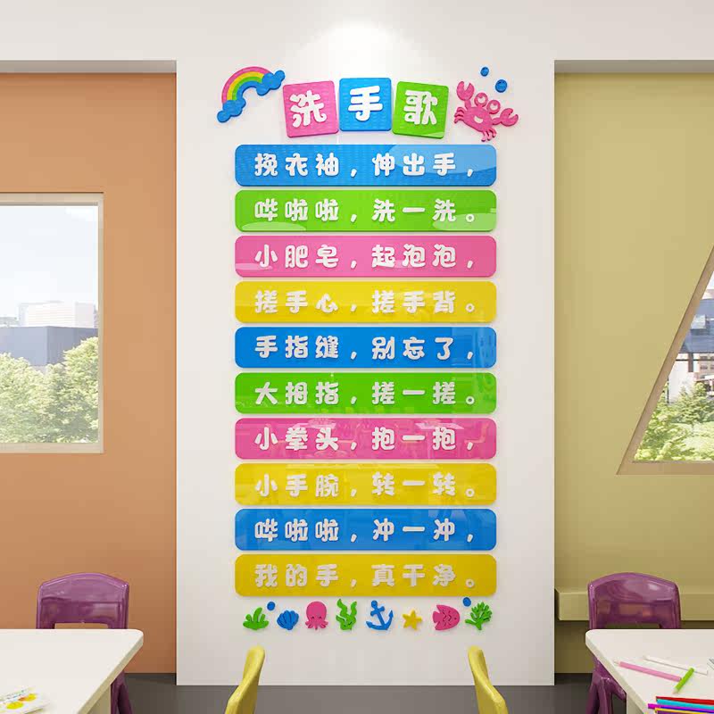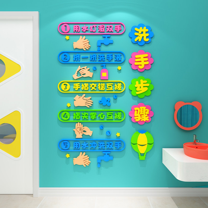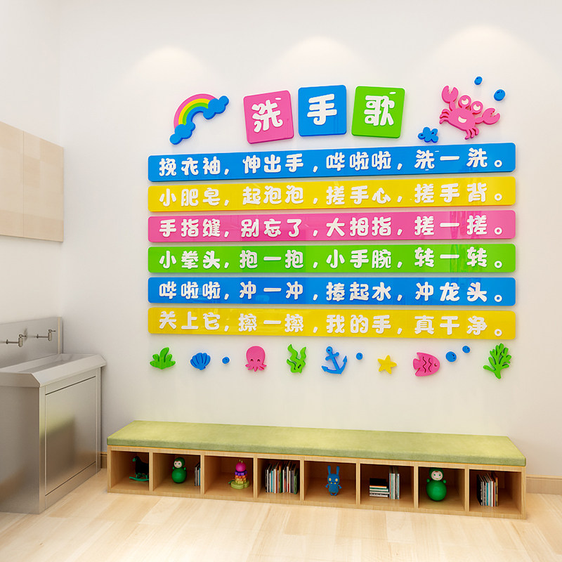 Kindergarten hand washing song cartoon three-dimensional wall sticker dressing room environment layout ring creating slogan wall decoration sticker