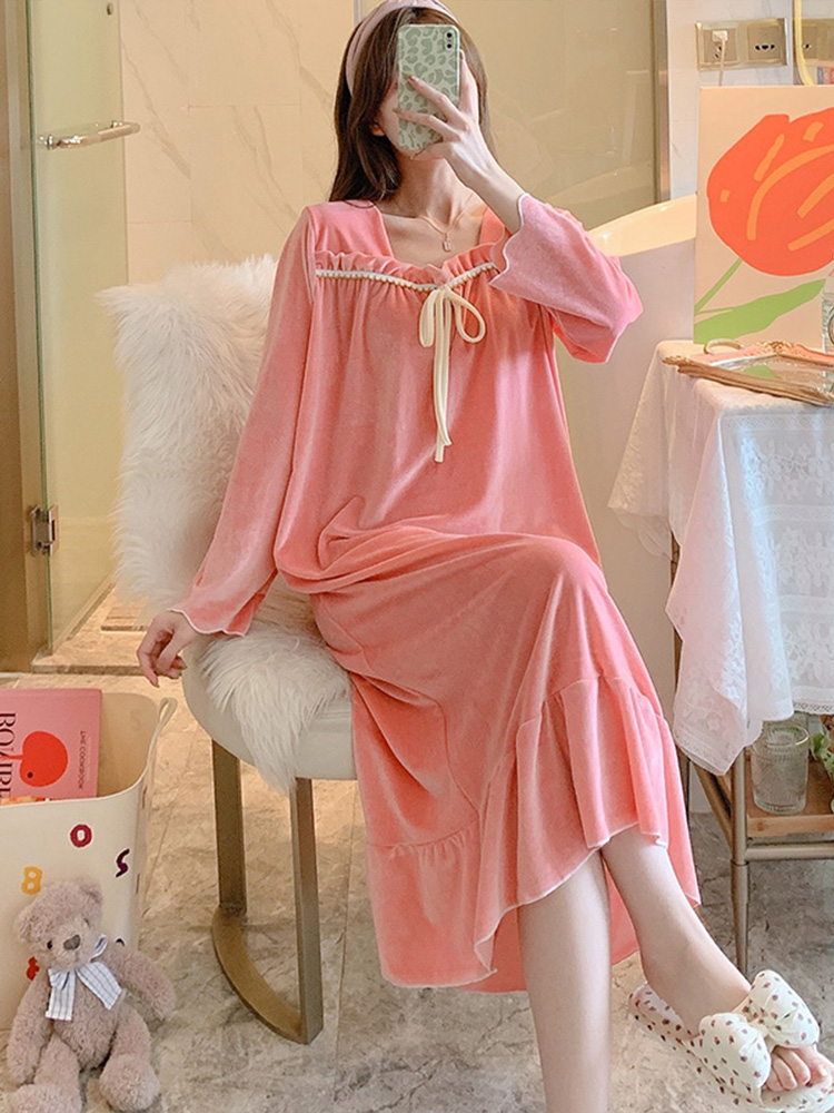 Quiet and gentle feeling ~ temperament British style gold velvet nightdress women's long-sleeved sweet autumn and winter pajamas can be worn outside