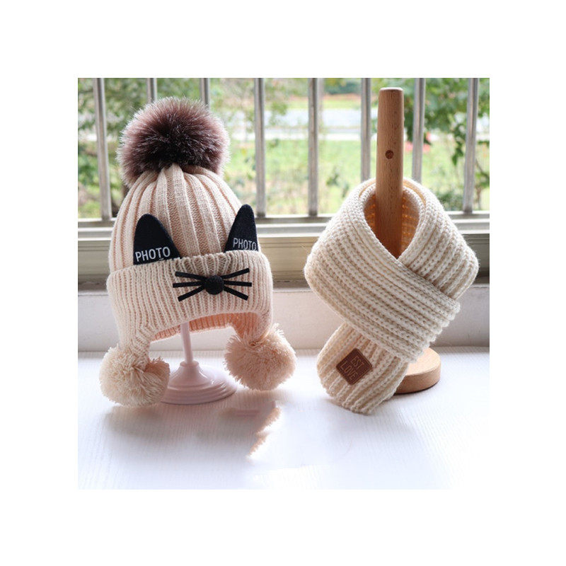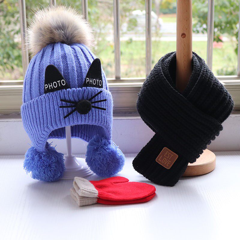 Baby Hat Scarf Kids thickened knitting Hat around neck gloves cute cat in autumn winter