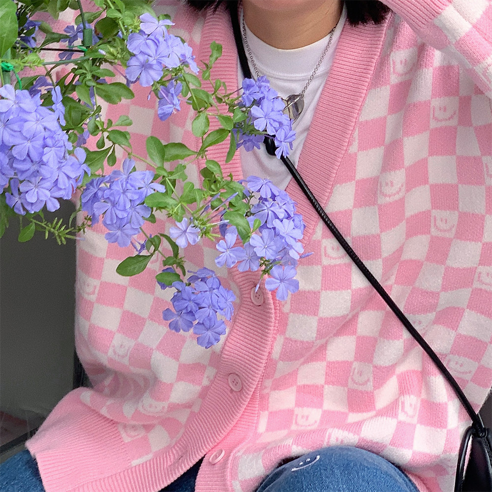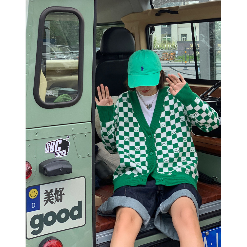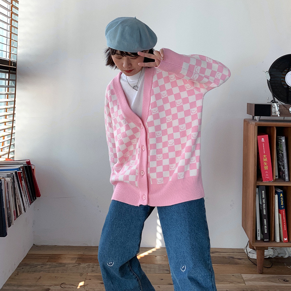 Beautiful Store MeihaoStore Smiley Checkerboard Knitted Loose Lazy Cardigan Velvet Sweater Jacket Men