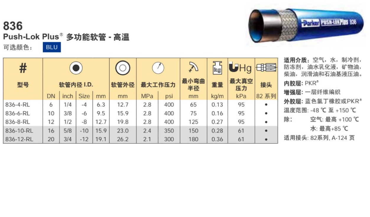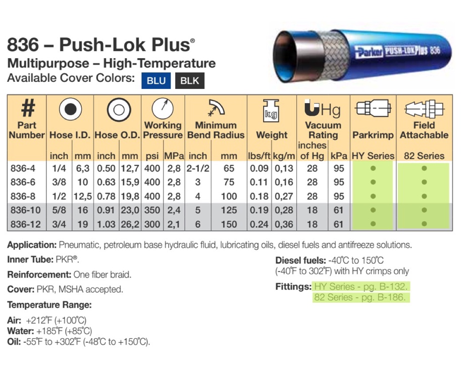 Pike blue water pipe 836-8parker pushlok plus hi-temp high temperature rubber hose tubing