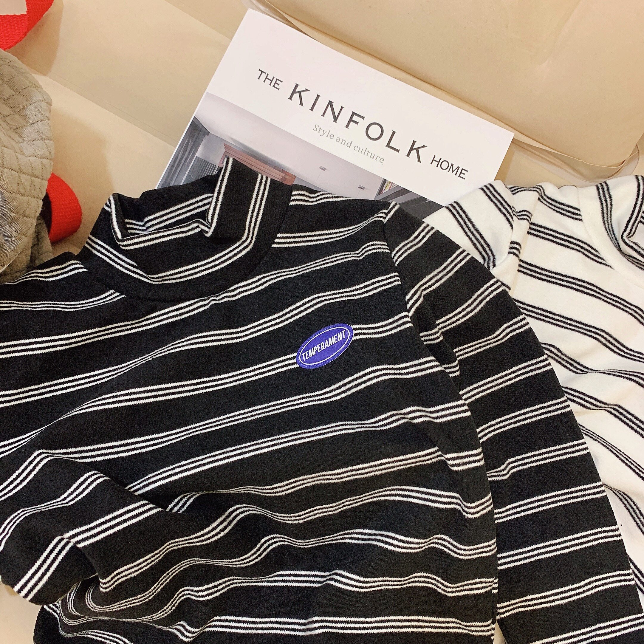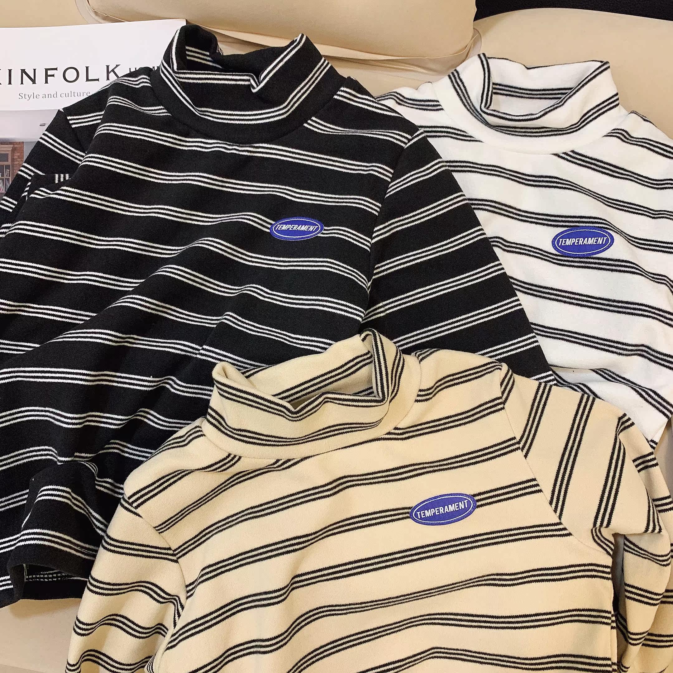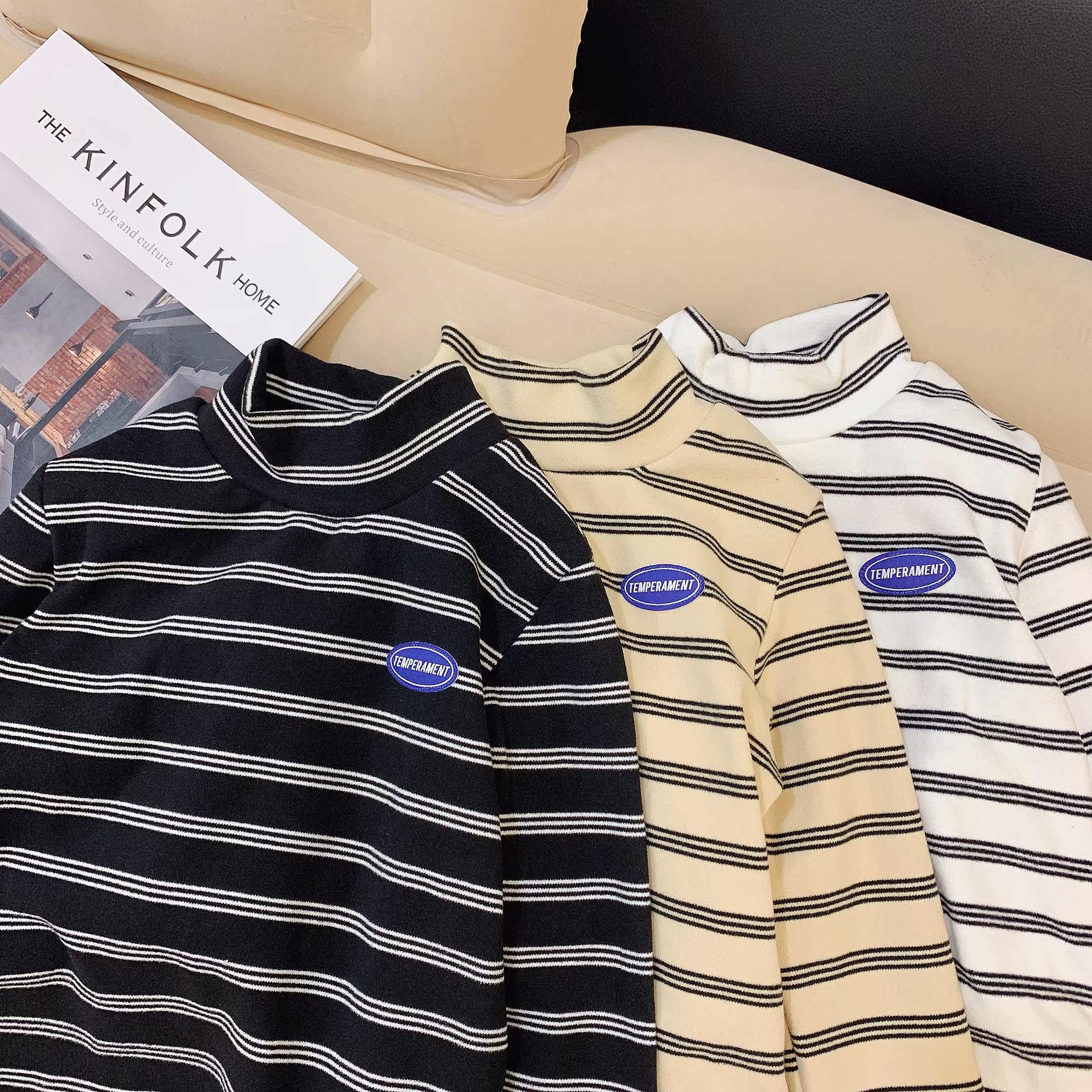 Boys' Half Turtleneck Brushed Bottoming Shirts Autumn and Winter Children's Long Sleeve T-Shirts for Boys Striped Stretch Bottoms