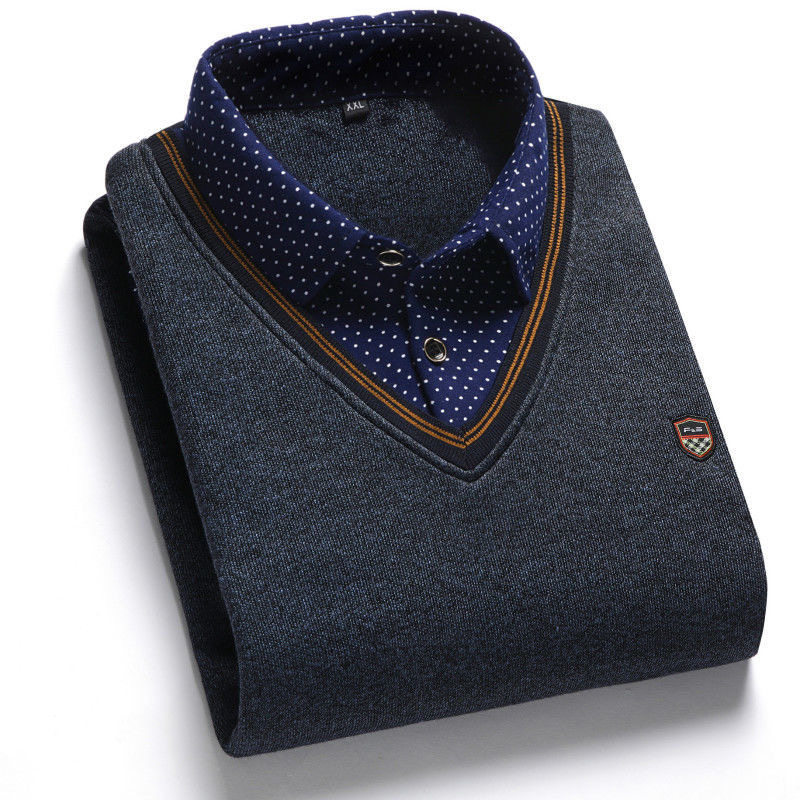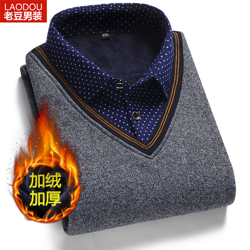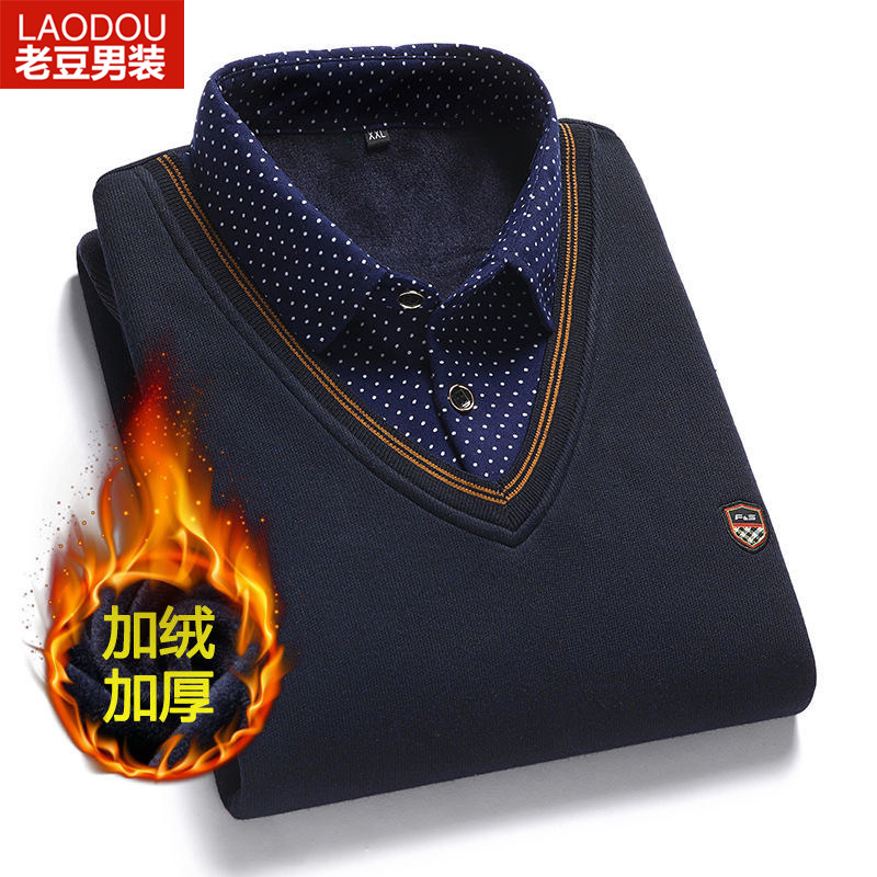 Middle Aged Sweater Men's Shirt Collar Plus Suede Thickened Winter Needling Jersey Blouse Dad Dress Fake Two-piece Undershirt