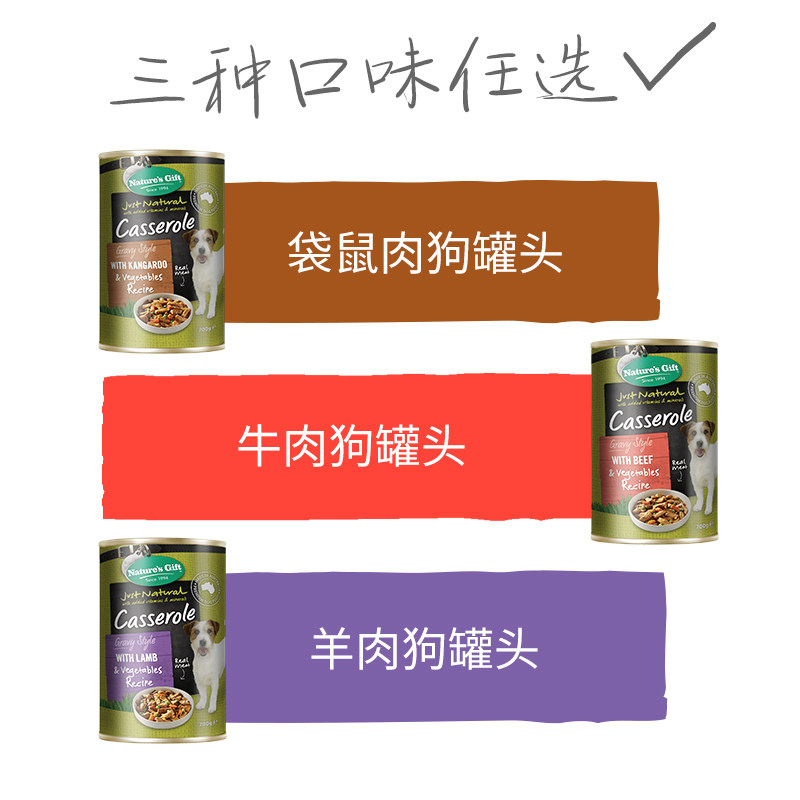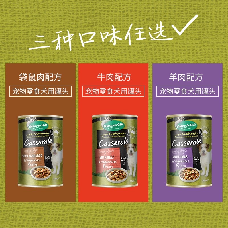 Beef and vegetables (700g*4 cans) Lamb and vegetables (700g*4 cans) Kangaroo meat and vegetables (700g*4 cans)