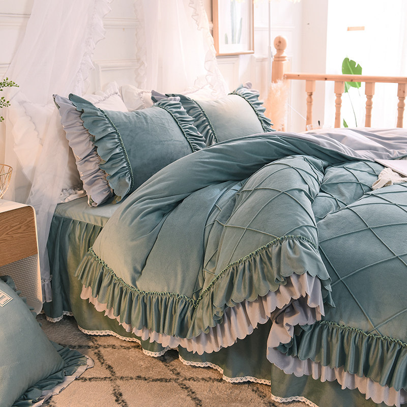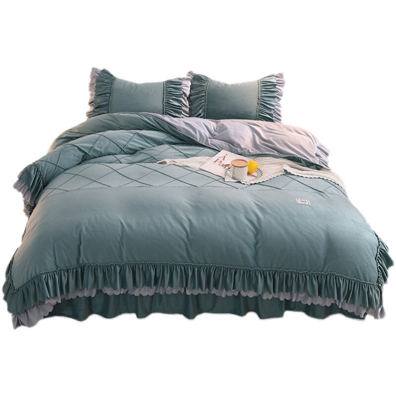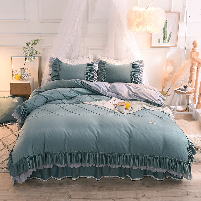 Korean-style thickened crystal velvet four-piece winter warm double-sided coral velvet quilt cover princess bed skirt flannel