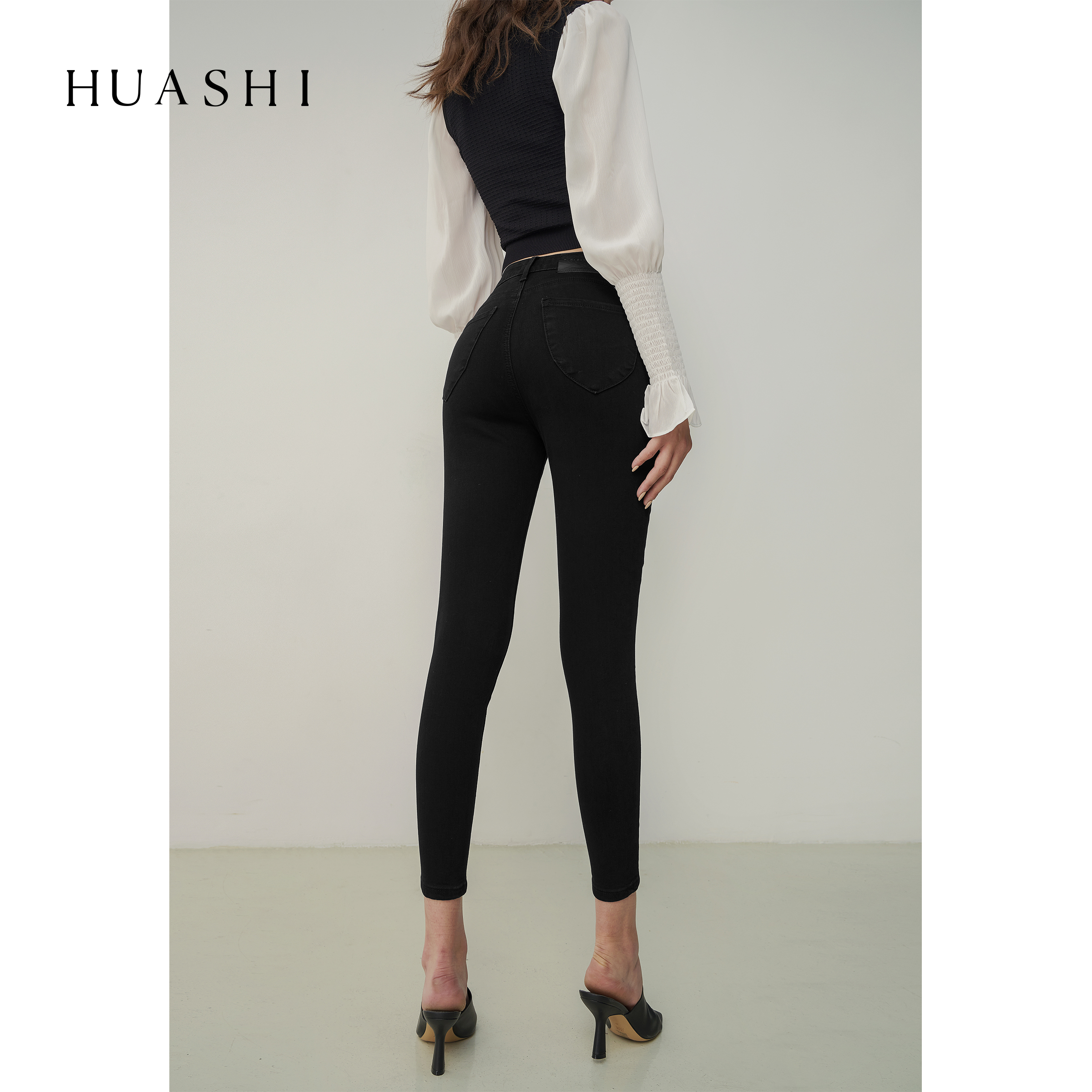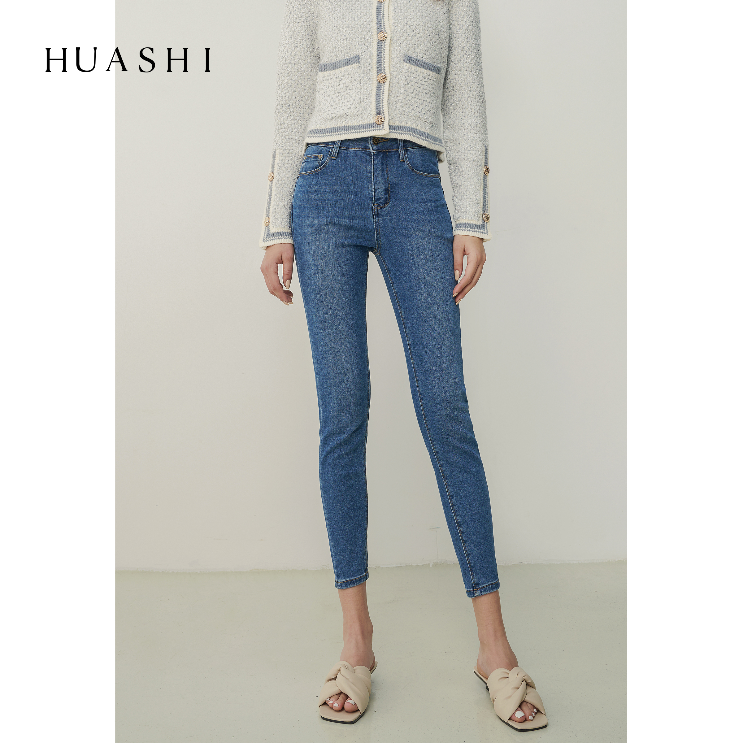 Huashi black high waist jeans female mens thin winter warm blue pencil little pants new style