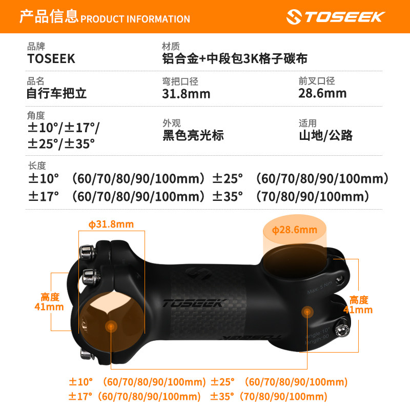TOSEEK bar set three-piece ZF-ONE bright cursor mountain bike straight seat tube seat post to riser riser carbon fiber