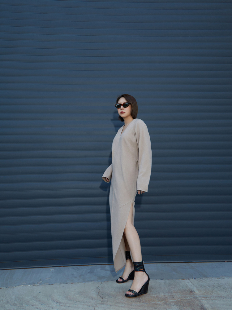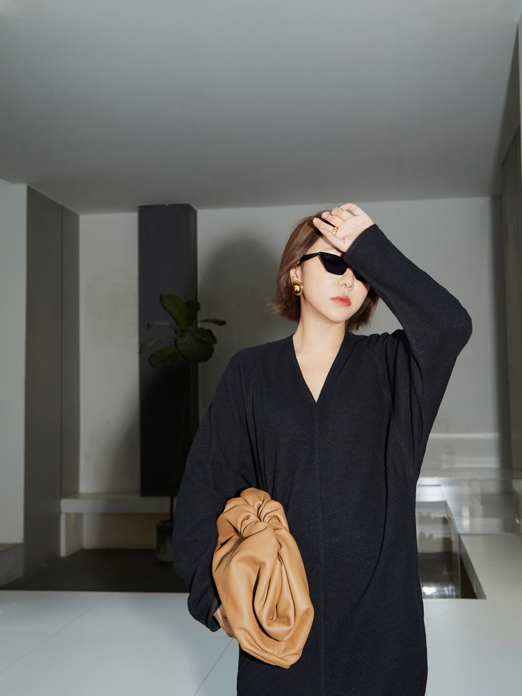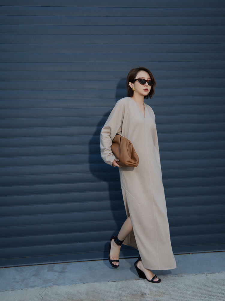 Z Boss Autumn and Winter Wool Knitted Improved Cheongsam Dress V Neck Diamond Stitching Sleeve Long Dress Women
