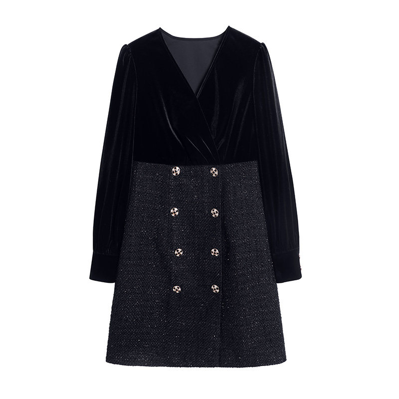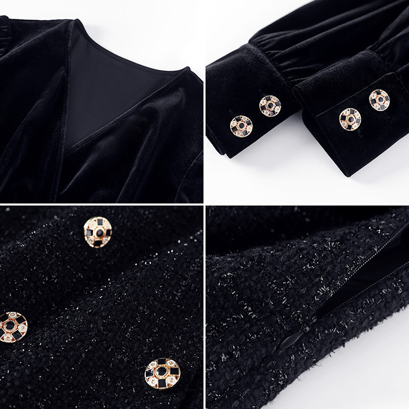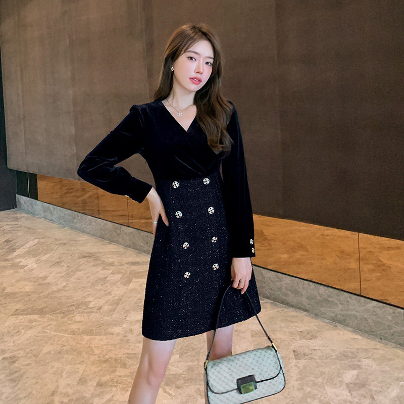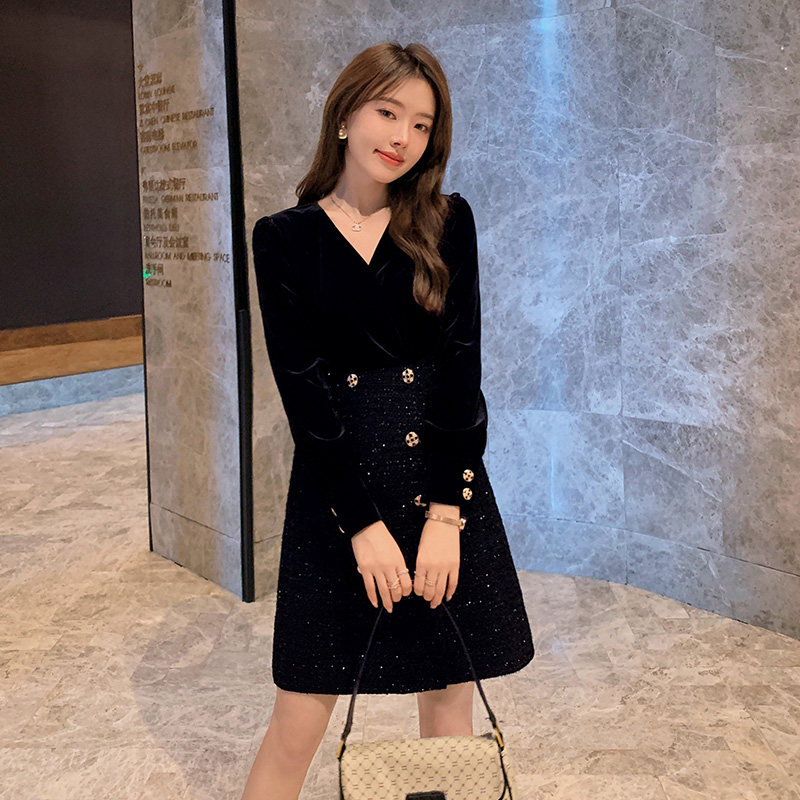Blue language large size women's fat mm temperament V-neck stitching velvet dress 2021 autumn and winter slim bottom black dress