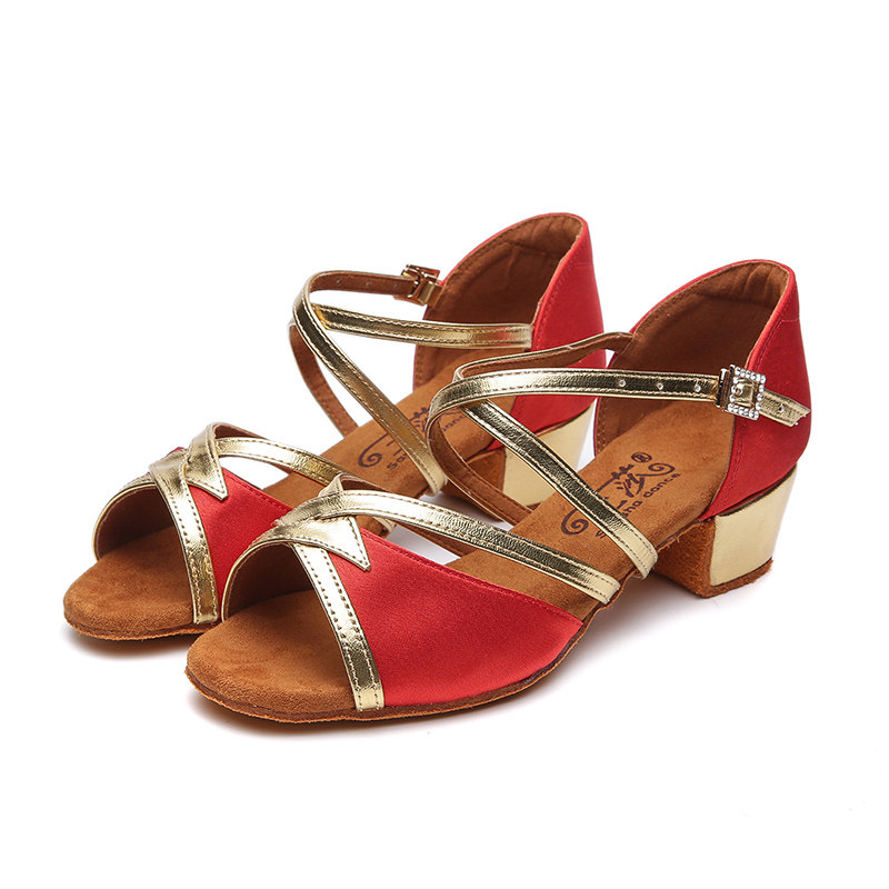 New Splicing High Heel Latin Dance Shoes Children Red Dancing Practice Shoes Satin Soft Bottom Dancing Shoes Precisely Samba