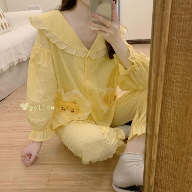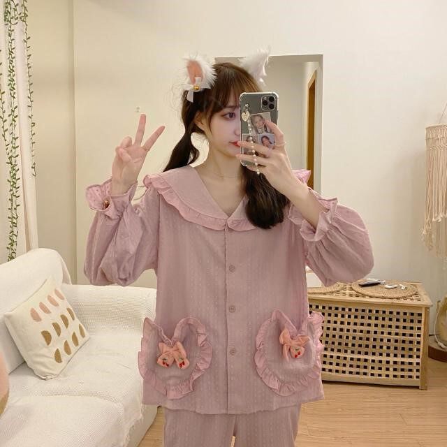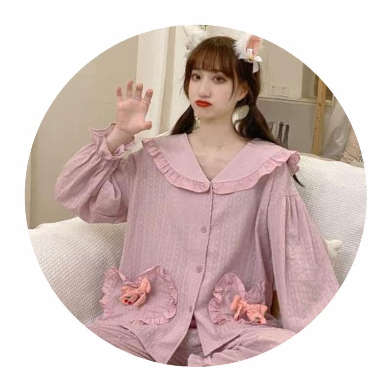 Sweet Girl Lotus Leaf Lace Dolls Collar Embroidery Long Sleeves At-home Suit Female Princess Wind Cute Student Sleepwear Tide