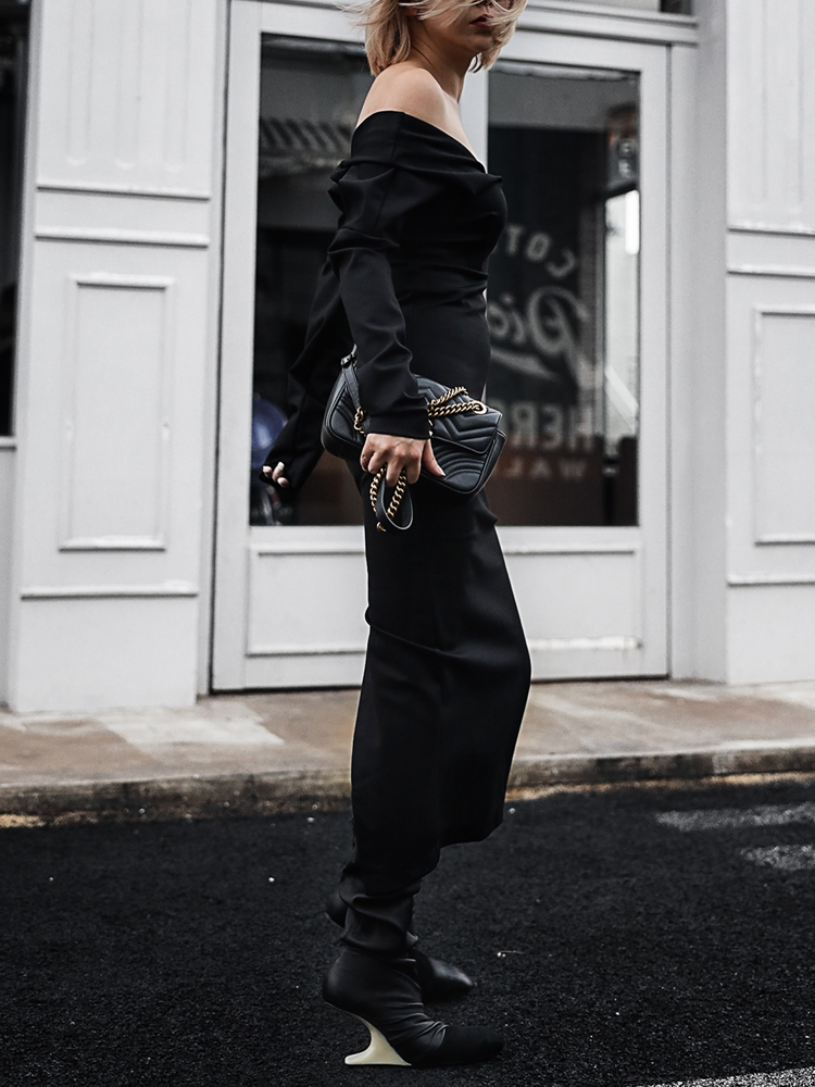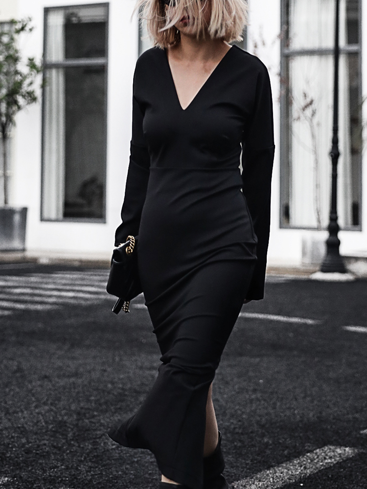 Boss Z two-wear V-neck hanging shoulder dress high-elastic long-sleeved slim mid-length party senior evening dress women