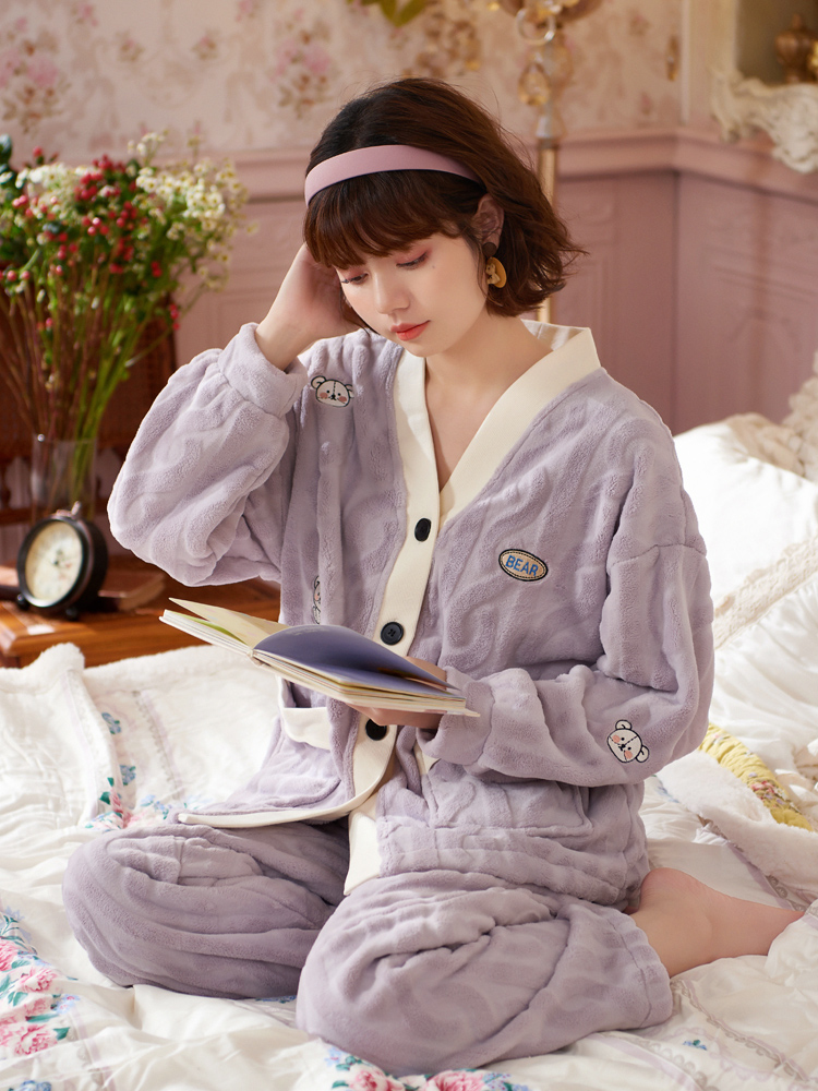 Beauty asphyxiation ~ chao Eyed Coral Suede Pyjamas Women's Winter V Collar Winter Sweet Beauty Can Outwear Purple Home Clothing