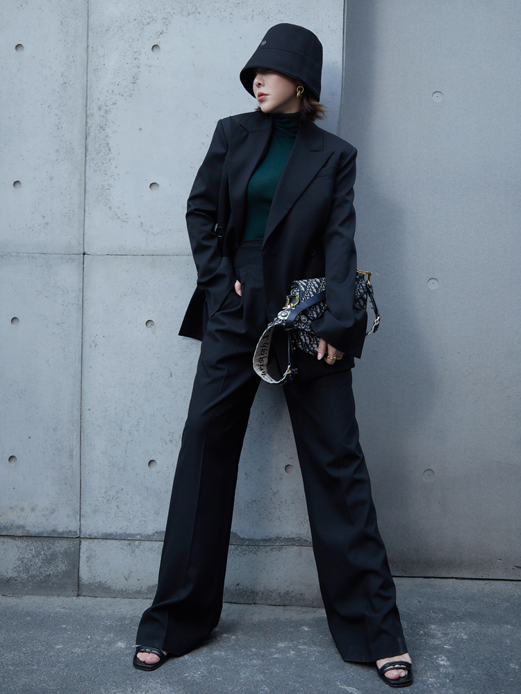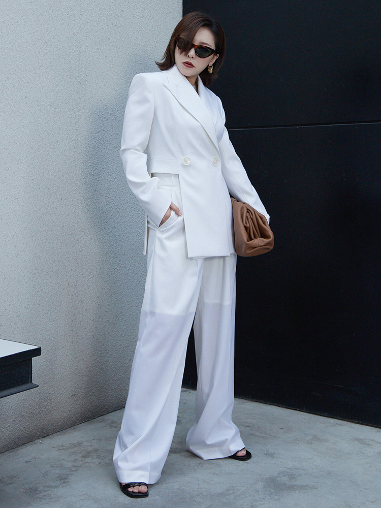 Boss Z Large collar wide shoulders slim fit asymmetrical wool suit High waist straight wide leg commuter trousers women
