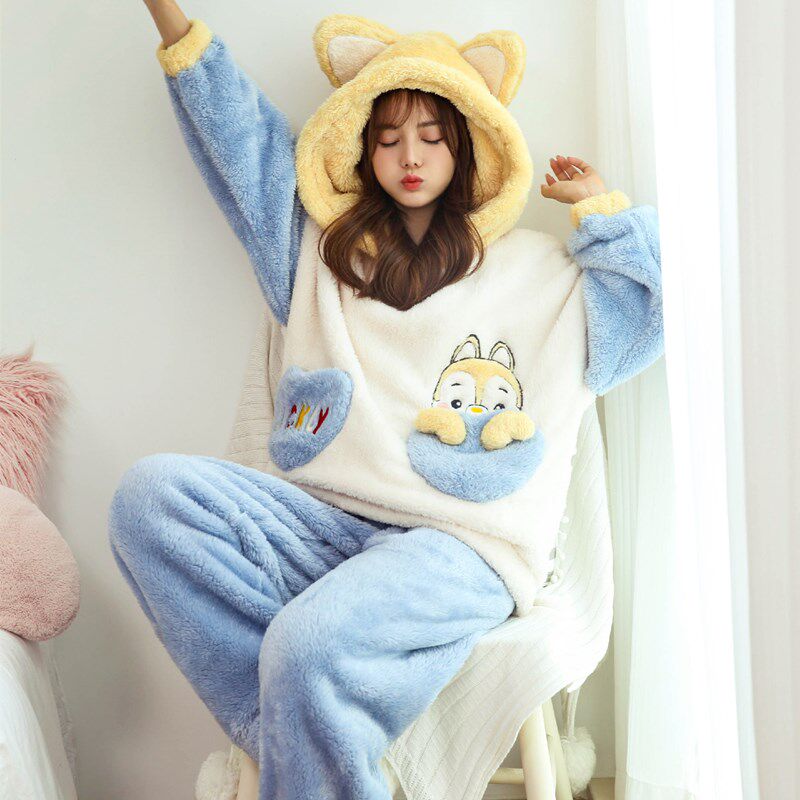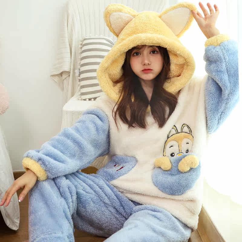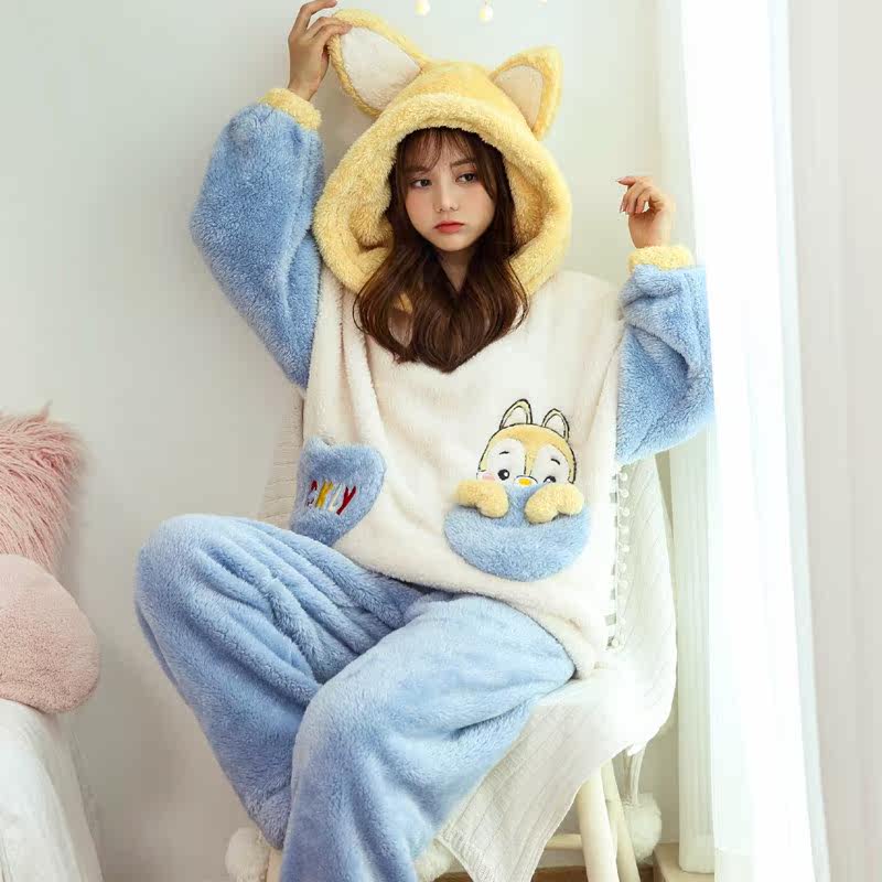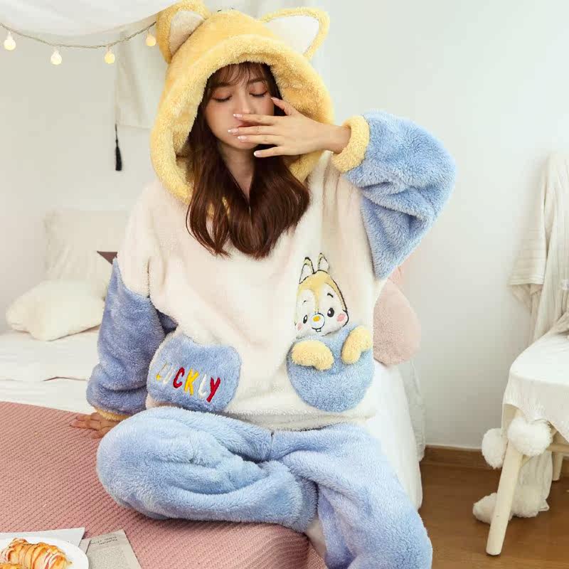 Coral fleece pajamas women's autumn and winter thickening 2022 new cute cartoon girls can wear home clothes suits