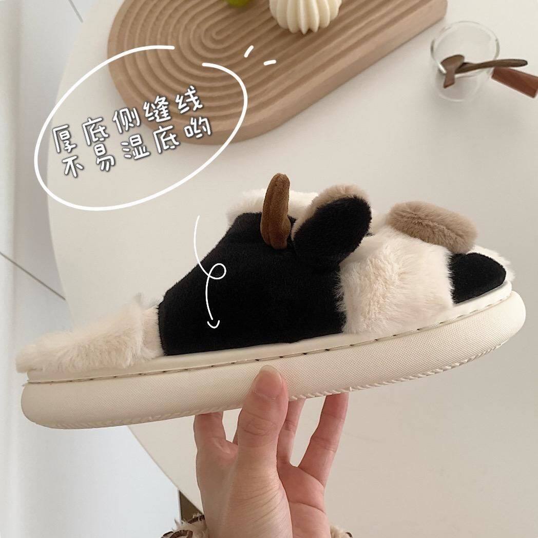 Korean Version Cute Cartoon Dairy Cow Cotton Slippers Female Winter Ins Tide Students Home Non-slip Warm Fur Shoes