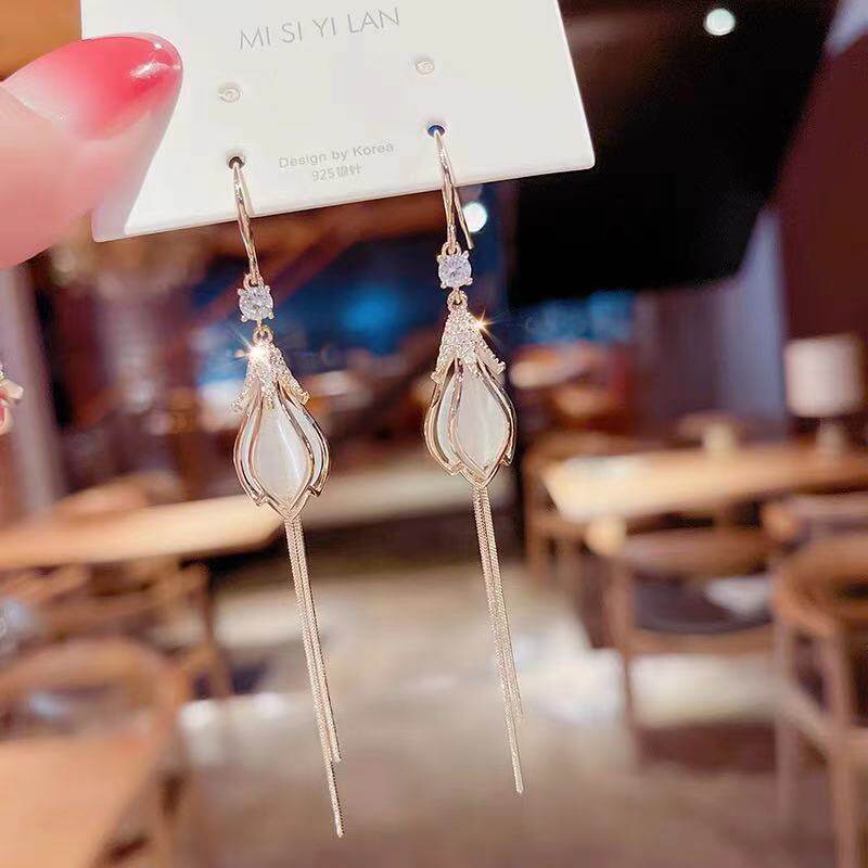 Advanced Sensation Small Crowdflower Earrings Woman Korean temperament Long version Stream Sear pendant design Cat Eye Stone Sensation Net Red Earl