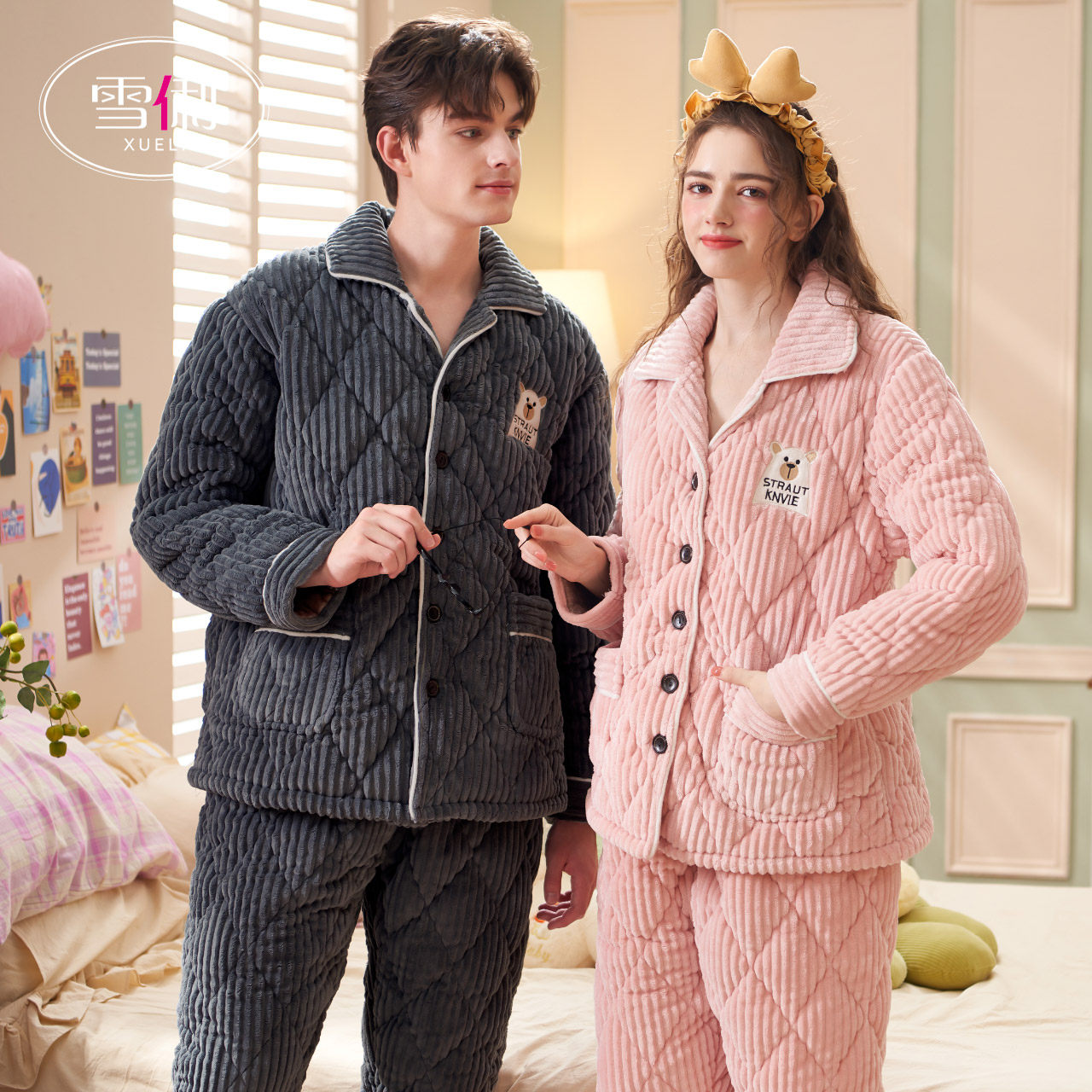Snow Li couple pajamas women winter thickened plus plush three layers of cotton coral wool men's housewear autumn winter winter set
